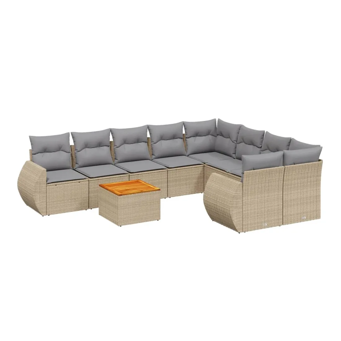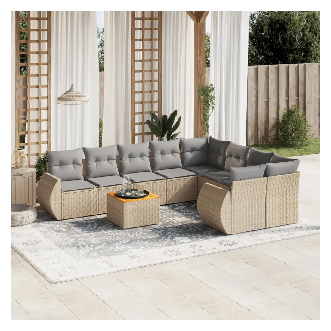Cet ensemble de canapés de jardin est le complément parfait de votre arrière-cour, terrasse ou patio, offrant un espace confortable et accueillant pour discuter avec la famille et les amis ou simplement se détendre et profiter de l'extérieur. Matériau durable : la résine tressée, également connue sous le nom de poly rotin, est un matériau synthétique solide et nécessitant peu d'entretien qui ressemble au rotin naturel. Il est léger, facile à nettoyer et couramment utilisé pour les meubles d'extérieur en raison de sa durabilité et de ses propriétés de résistance aux intempéries.Dessus stable et facile à nettoyer : cette table de jardin a un dessus en bois d'acacia robuste, durable et facile à nettoyer avec un chiffon humide. Fonction de rangement avec sac résistant à l'eau : chaque siège de jardin dispose d'un espace de rangement sous l'assise, complété par un sac résistant à l'eau pour ranger les coussins, les jouets et d'autres objets. Les sacs intérieurs sont dotés d'un couvercle et peuvent être solidement fixés aux sièges à l'aide de bandes auto-agrippantes pour plus de stabilité.Expérience d'assise confortable : ce mobilier d'extérieur, doté de coussins épais, offre une expérience d'assise confortable.Conception modulaire : cet ensemble de meubles d'extérieur a une conception modulaire, ce qui le rend complètement flexible et facile à déplacer, afin que vous puissiez créer un agencement de meubles d'extérieur personnalisé. Bon à savoir :Pour que vos meubles d'extérieur restent beaux, nous vous recommandons de les protéger avec une housse imperméable.