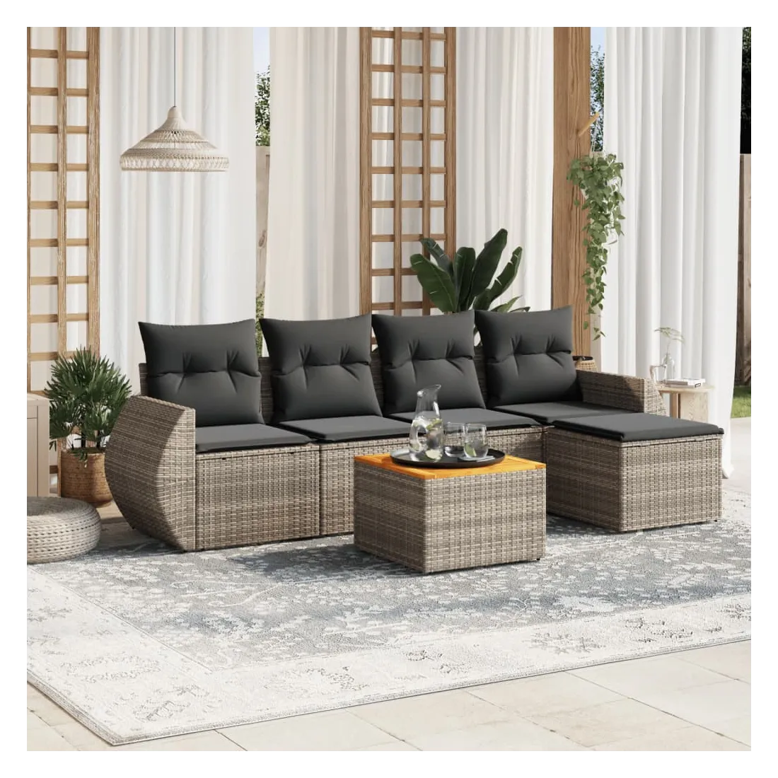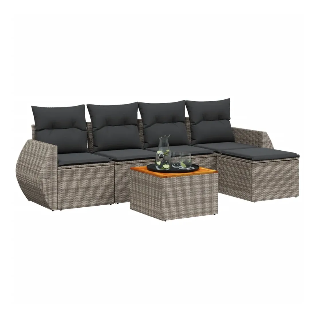 Cet ensemble de canapés de jardin est le complément parfait de votre arrière-cour, terrasse ou patio, offrant un espace confortable et accueillant pour discuter avec la famille et les amis ou simplement se détendre et profiter de l'extérieur. Matériau durable : la résine tressée, également connue sous le nom de poly rotin, est un matériau synthétique solide et nécessitant peu d'entretien qui ressemble au rotin naturel. Il est léger, facile à nettoyer et couramment utilisé pour les meubles d'extérieur en raison de sa durabilité et de ses propriétés de résistance aux intempéries.Dessus stable et facile à nettoyer : cette table de jardin a un dessus en bois d'acacia robuste, durable et facile à nettoyer avec un chiffon humide. Fonction de rangement avec sac résistant à l'eau : chaque siège de jardin dispose d'un espace de rangement sous l'assise, complété par un sac résistant à l'eau pour ranger les coussins, les jouets et d'autres objets. Les sacs intérieurs sont dotés d'un couvercle et peuvent être solidement fixés aux sièges à l'aide de bandes auto-agrippantes pour plus de stabilité.Expérience d'assise confortable : ce mobilier d'extérieur, doté de coussins épais, offre une expérience d'assise confortable.Conception modulaire : cet ensemble de meubles d'extérieur a une conception modulaire, ce qui le rend complètement flexible et facile à déplacer, afin que vous puissiez créer un agencement de meubles d'extérieur personnalisé. Bon à savoir :Pour que vos meubles d'extérieur restent beaux, nous vous recommandons de les protéger avec une housse imperméable.