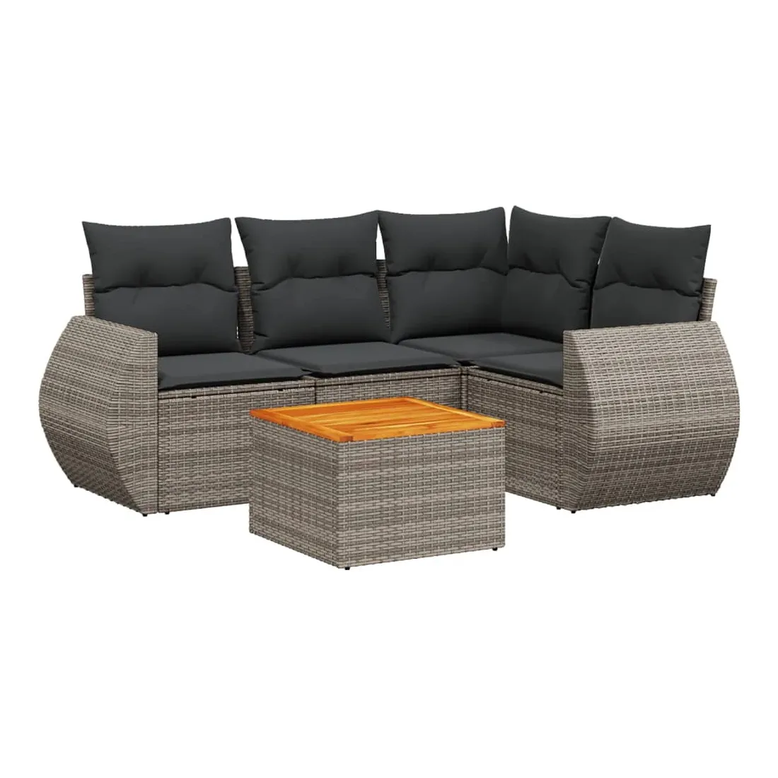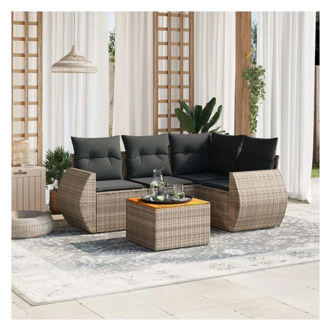 Cet ensemble de canapés de jardin est le complément parfait de votre arrière-cour, terrasse ou patio, offrant un espace confortable et accueillant pour discuter avec la famille et les amis ou simplement se détendre et profiter de l'extérieur. Matériau durable : la résine tressée, également connue sous le nom de poly rotin, est un matériau synthétique solide et nécessitant peu d'entretien qui ressemble au rotin naturel. Il est léger, facile à nettoyer et couramment utilisé pour les meubles d'extérieur en raison de sa durabilité et de ses propriétés de résistance aux intempéries.Dessus stable et facile à nettoyer : cette table de jardin a un dessus en bois d'acacia robuste, durable et facile à nettoyer avec un chiffon humide. Fonction de rangement avec sac résistant à l'eau : chaque siège de jardin dispose d'un espace de rangement sous l'assise, complété par un sac résistant à l'eau pour ranger les coussins, les jouets et d'autres objets. Les sacs intérieurs sont dotés d'un couvercle et peuvent être solidement fixés aux sièges à l'aide de bandes auto-agrippantes pour plus de stabilité.Expérience d'assise confortable : ce mobilier d'extérieur, doté de coussins épais, offre une expérience d'assise confortable.Conception modulaire : cet ensemble de meubles d'extérieur a une conception modulaire, ce qui le rend complètement flexible et facile à déplacer, afin que vous puissiez créer un agencement de meubles d'extérieur personnalisé. Bon à savoir :Pour que vos meubles d'extérieur restent beaux, nous vous recommandons de les protéger avec une housse imperméable.