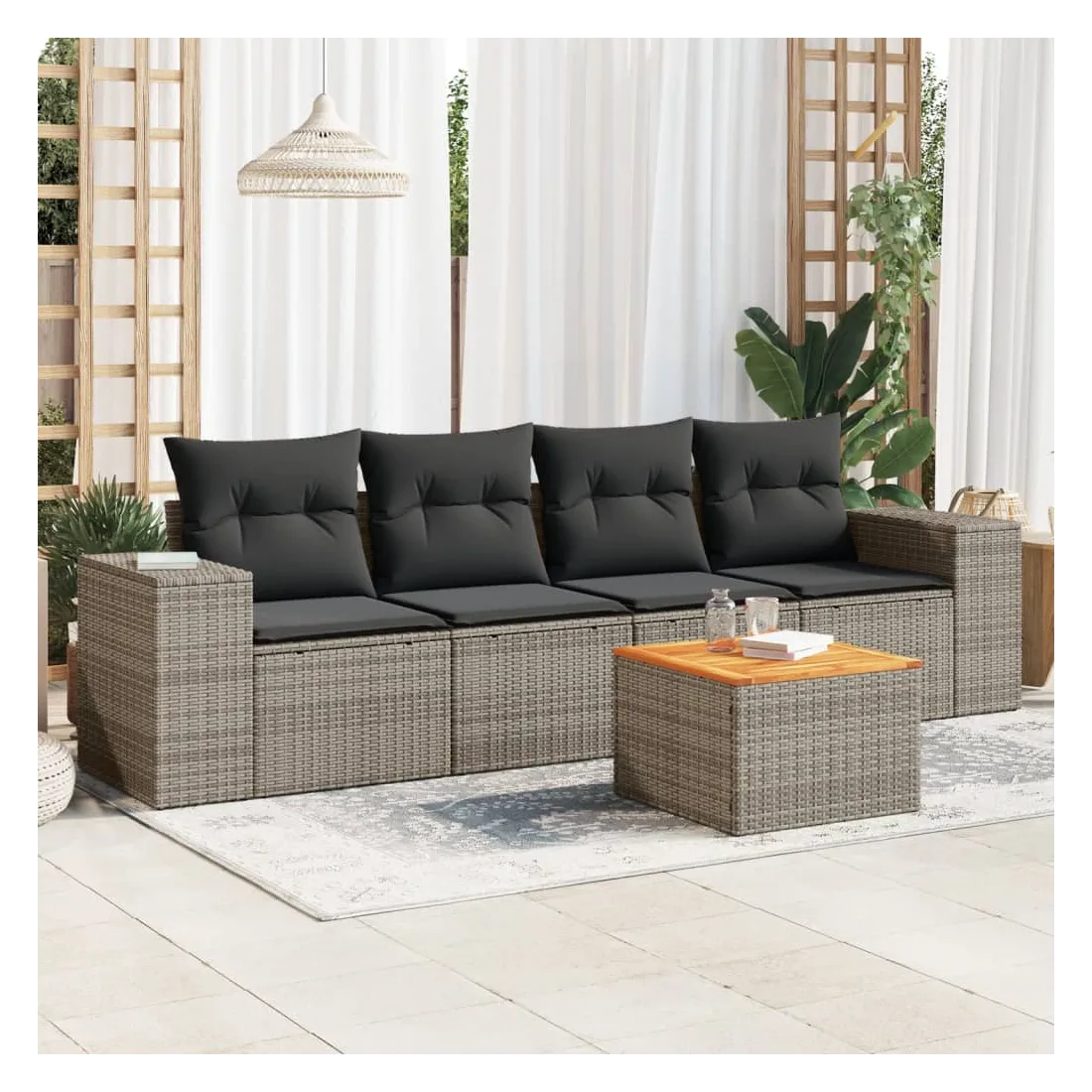 Cet ensemble de canapés de jardin est le complément parfait de votre arrière-cour, terrasse ou patio, offrant un espace confortable et accueillant pour discuter avec la famille et les amis ou simplement se détendre et profiter de l'extérieur. Matériau durable : la résine tressée, également connue sous le nom de poly rotin, est un matériau synthétique solide et nécessitant peu d'entretien qui ressemble au rotin naturel. Il est léger, facile à nettoyer et couramment utilisé pour les meubles d'extérieur en raison de sa durabilité et de ses propriétés de résistance aux intempéries. Fonction de rangement avec sac résistant à l'eau : chaque siège de jardin dispose d'un espace de rangement sous l'assise, complété par un sac résistant à l'eau pour ranger les coussins, les jouets et d'autres objets. Les sacs intérieurs sont dotés d'un couvercle et peuvent être solidement fixés aux sièges à l'aide de bandes auto-agrippantes pour plus de stabilité. Dessus stable et facile à nettoyer : cette table de jardin a un dessus en bois d'acacia robuste, durable et facile à nettoyer avec un chiffon humide. Expérience d'assise confortable : ce mobilier d'extérieur, doté de coussins épais, offre une expérience d'assise confortable. Conception modulaire : cet ensemble de meubles d'extérieur a une conception modulaire, ce qui le rend complètement flexible et facile à déplacer, afin que vous puissiez créer un agencement de meubles d'extérieur personnalisé. Bon à savoir :Pour que vos meubles d'extérieur restent beaux, nous vous recommandons de les protéger avec une housse imperméable.