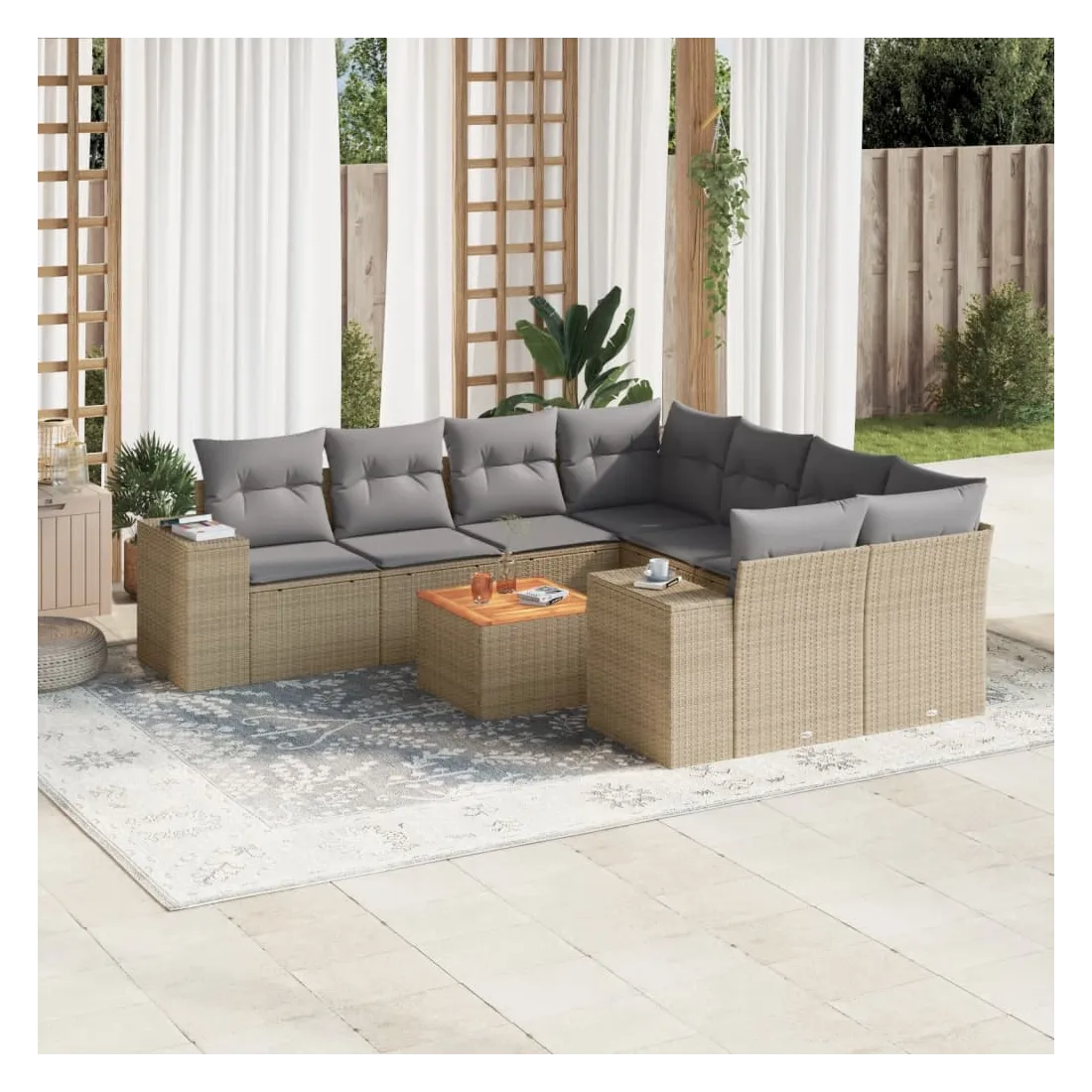 Cet ensemble de canapés de jardin est le complément parfait de votre arrière-cour, terrasse ou patio, offrant un espace confortable et accueillant pour discuter avec la famille et les amis ou simplement se détendre et profiter de l'extérieur. Matériau durable : la résine tressée, également connue sous le nom de poly rotin, est un matériau synthétique solide et nécessitant peu d'entretien qui ressemble au rotin naturel. Il est léger, facile à nettoyer et couramment utilisé pour les meubles d'extérieur en raison de sa durabilité et de ses propriétés de résistance aux intempéries.Dessus stable et facile à nettoyer : cette table de jardin a un dessus en bois d'acacia robuste, durable et facile à nettoyer avec un chiffon humide. Fonction de rangement avec sac résistant à l'eau : chaque siège de jardin dispose d'un espace de rangement sous l'assise, complété par un sac résistant à l'eau pour ranger les coussins, les jouets et d'autres objets. Les sacs intérieurs sont dotés d'un couvercle et peuvent être solidement fixés aux sièges à l'aide de bandes auto-agrippantes pour plus de stabilité.Expérience d'assise confortable : ce mobilier d'extérieur, doté de coussins épais, offre une expérience d'assise confortable.Conception modulaire : cet ensemble de meubles d'extérieur a une conception modulaire, ce qui le rend complètement flexible et facile à déplacer, afin que vous puissiez créer un agencement de meubles d'extérieur personnalisé. Bon à savoir :Pour que vos meubles d'extérieur restent beaux, nous vous recommandons de les protéger avec une housse imperméable.