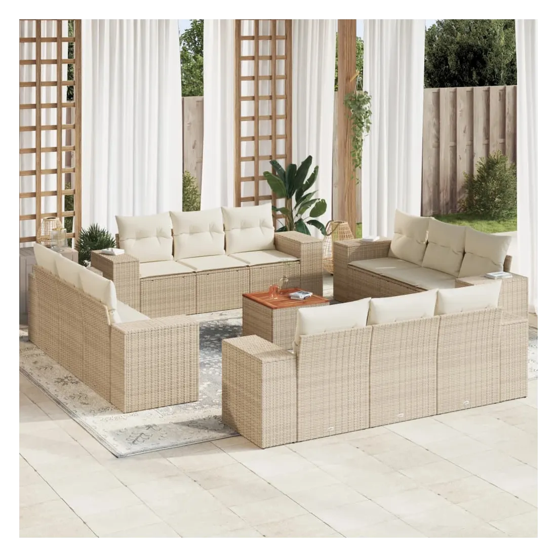 Cet ensemble de canapés de jardin est le complément parfait de votre arrière-cour, terrasse ou patio, offrant un espace confortable et accueillant pour discuter avec la famille et les amis ou simplement se détendre et profiter de l'extérieur. Matériau durable : la résine tressée, également connue sous le nom de poly rotin, est un matériau synthétique solide et nécessitant peu d'entretien qui ressemble au rotin naturel. Il est léger, facile à nettoyer et couramment utilisé pour les meubles d'extérieur en raison de sa durabilité et de ses propriétés de résistance aux intempéries. Fonction de rangement avec sac résistant à l'eau : chaque siège de jardin dispose d'un espace de rangement sous l'assise, complété par un sac résistant à l'eau pour ranger les coussins, les jouets et d'autres objets. Les sacs intérieurs sont dotés d'un couvercle et peuvent être solidement fixés aux sièges à l'aide de bandes auto-agrippantes pour plus de stabilité. Dessus stable et facile à nettoyer : cette table de jardin a un dessus en bois d'acacia robuste, durable et facile à nettoyer avec un chiffon humide. Expérience d'assise confortable : ce mobilier d'extérieur, doté de coussins épais, offre une expérience d'assise confortable. Conception modulaire : cet ensemble de meubles d'extérieur a une conception modulaire, ce qui le rend complètement flexible et facile à déplacer, afin que vous puissiez créer un agencement de meubles d'extérieur personnalisé. Bon à savoir :Pour que vos meubles d'extérieur restent beaux, nous vous recommandons de les protéger avec une housse imperméable.