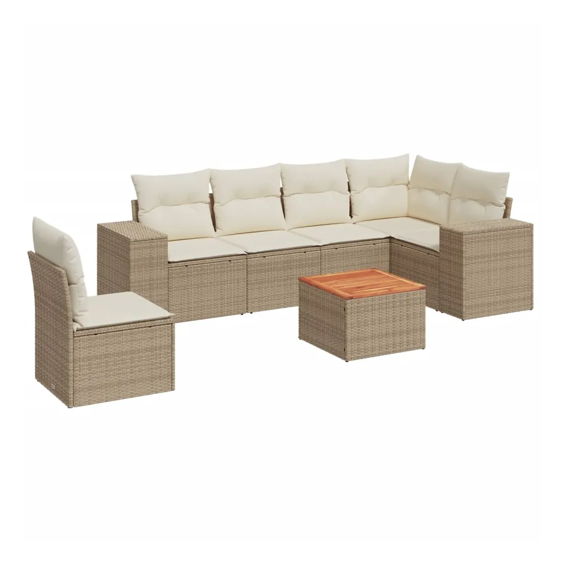 Cet ensemble de canapés de jardin est le complément parfait de votre arrière-cour, terrasse ou patio, offrant un espace confortable et accueillant pour discuter avec la famille et les amis ou simplement se détendre et profiter de l'extérieur. Matériau durable : la résine tressée, également connue sous le nom de poly rotin, est un matériau synthétique solide et nécessitant peu d'entretien qui ressemble au rotin naturel. Il est léger, facile à nettoyer et couramment utilisé pour les meubles d'extérieur en raison de sa durabilité et de ses propriétés de résistance aux intempéries. Fonction de rangement avec sac résistant à l'eau : chaque siège de jardin dispose d'un espace de rangement sous l'assise, complété par un sac résistant à l'eau pour ranger les coussins, les jouets et d'autres objets. Les sacs intérieurs sont dotés d'un couvercle et peuvent être solidement fixés aux sièges à l'aide de bandes auto-agrippantes pour plus de stabilité. Dessus stable et facile à nettoyer : cette table de jardin a un dessus en bois d'acacia robuste, durable et facile à nettoyer avec un chiffon humide. Expérience d'assise confortable : ce mobilier d'extérieur, doté de coussins épais, offre une expérience d'assise confortable. Conception modulaire : cet ensemble de meubles d'extérieur a une conception modulaire, ce qui le rend complètement flexible et facile à déplacer, afin que vous puissiez créer un agencement de meubles d'extérieur personnalisé. Bon à savoir :Pour que vos meubles d'extérieur restent beaux, nous vous recommandons de les protéger avec une housse imperméable.