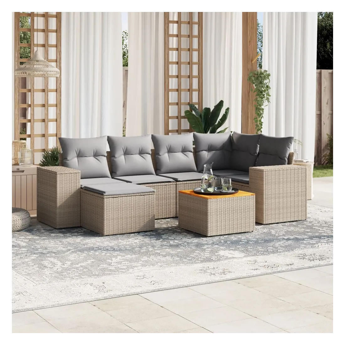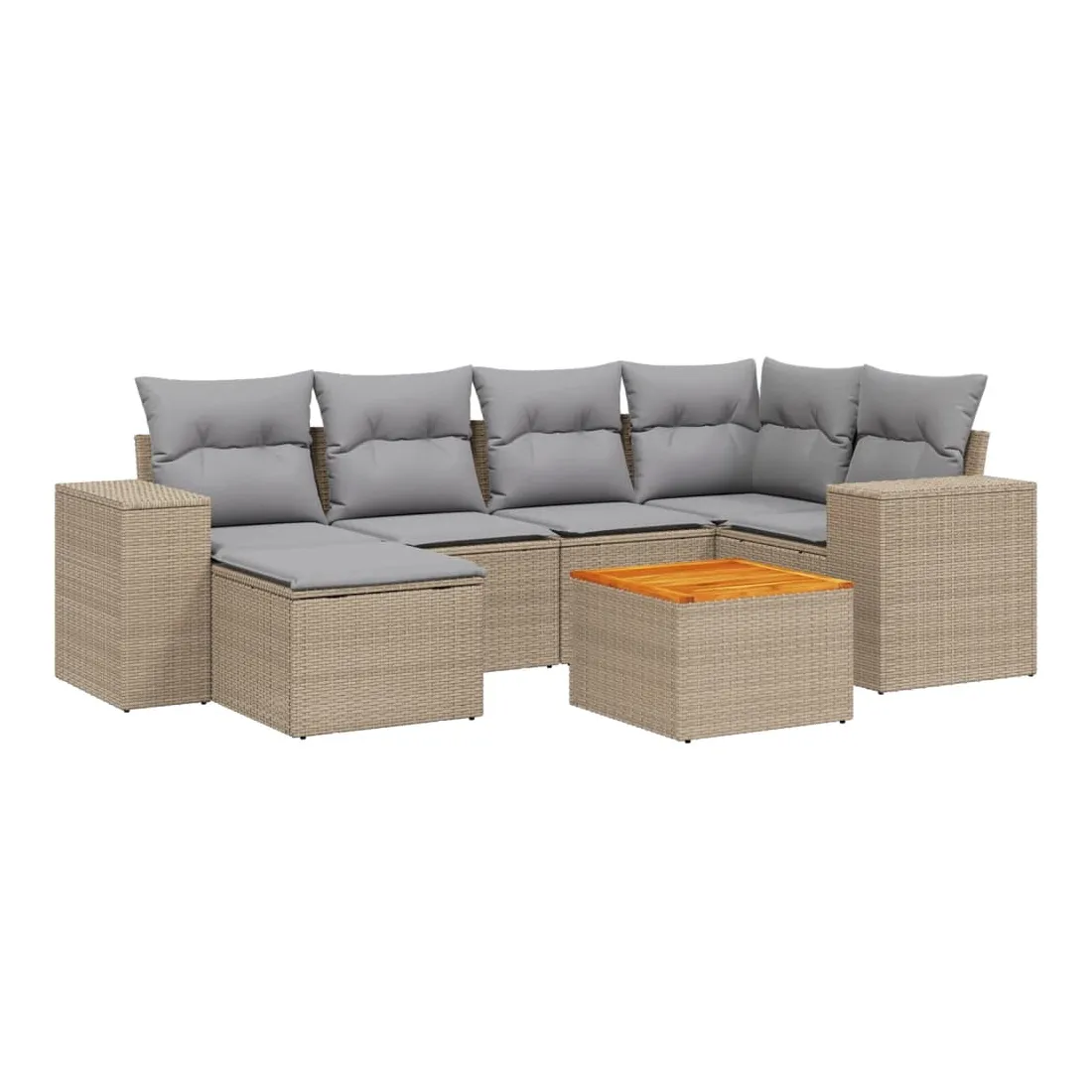 Cet ensemble de canapés de jardin est le complément parfait de votre arrière-cour, terrasse ou patio, offrant un espace confortable et accueillant pour discuter avec la famille et les amis ou simplement se détendre et profiter de l'extérieur. Matériau durable : la résine tressée, également connue sous le nom de poly rotin, est un matériau synthétique solide et nécessitant peu d'entretien qui ressemble au rotin naturel. Il est léger, facile à nettoyer et couramment utilisé pour les meubles d'extérieur en raison de sa durabilité et de ses propriétés de résistance aux intempéries.Dessus stable et facile à nettoyer : cette table de jardin a un dessus en bois d'acacia robuste, durable et facile à nettoyer avec un chiffon humide. Fonction de rangement avec sac résistant à l'eau : chaque siège de jardin dispose d'un espace de rangement sous l'assise, complété par un sac résistant à l'eau pour ranger les coussins, les jouets et d'autres objets. Les sacs intérieurs sont dotés d'un couvercle et peuvent être solidement fixés aux sièges à l'aide de bandes auto-agrippantes pour plus de stabilité.Expérience d'assise confortable : ce mobilier d'extérieur, doté de coussins épais, offre une expérience d'assise confortable.Conception modulaire : cet ensemble de meubles d'extérieur a une conception modulaire, ce qui le rend complètement flexible et facile à déplacer, afin que vous puissiez créer un agencement de meubles d'extérieur personnalisé. Bon à savoir :Pour que vos meubles d'extérieur restent beaux, nous vous recommandons de les protéger avec une housse imperméable.