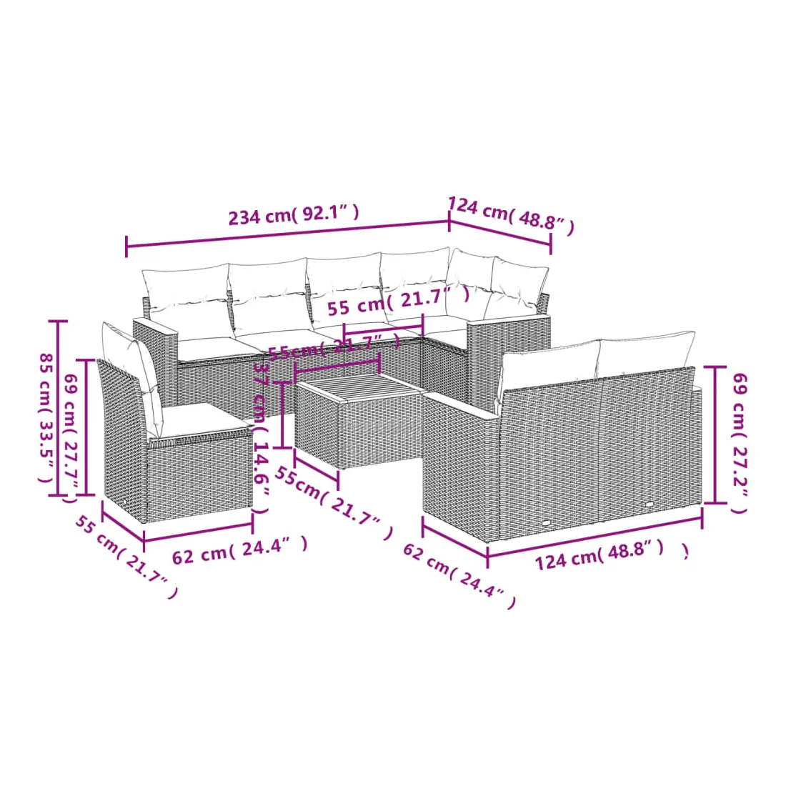 Salon de jardin 9 pcs avec coussins gris résine tressée