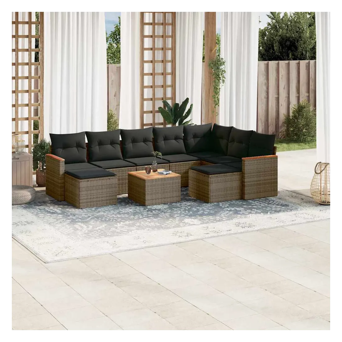 Cet ensemble de canapés de jardin est le complément parfait de votre arrière-cour, terrasse ou patio, offrant un espace confortable et accueillant pour discuter avec la famille et les amis ou simplement se détendre et profiter de l'extérieur. Matériau durable : la résine tressée, également connue sous le nom de poly rotin, est un matériau synthétique solide et nécessitant peu d'entretien qui ressemble au rotin naturel. Il est léger, facile à nettoyer et couramment utilisé pour les meubles d'extérieur en raison de sa durabilité et de ses propriétés de résistance aux intempéries.Fonction de rangement avec sac résistant à l'eau : le mobilier de jardin dispose d'un espace de rangement sous l'assise, complété par un sac résistant à l'eau pour ranger coussins, jouets et autres objets. Le sac intérieur peut être solidement fixé au mobilier d'extérieur grâce à des attaches auto-agrippantes pour plus de stabilité.Dessus stable et facile à nettoyer : cette table de jardin a un dessus en bois d'acacia robuste, durable et facile à nettoyer avec un chiffon humide.Housse amovible et lavable : ces coussins de siège sont dotés de housses amovibles pour un lavage et un entretien faciles.Conception modulaire : cet ensemble de meubles d'extérieur a une conception modulaire, ce qui le rend complètement flexible et facile à déplacer, afin que vous puissiez créer un agencement de meubles d'extérieur personnalisé. Bon à savoir :Pour que vos meubles d'extérieur restent beaux, nous vous recommandons de les protéger avec une housse imperméable.