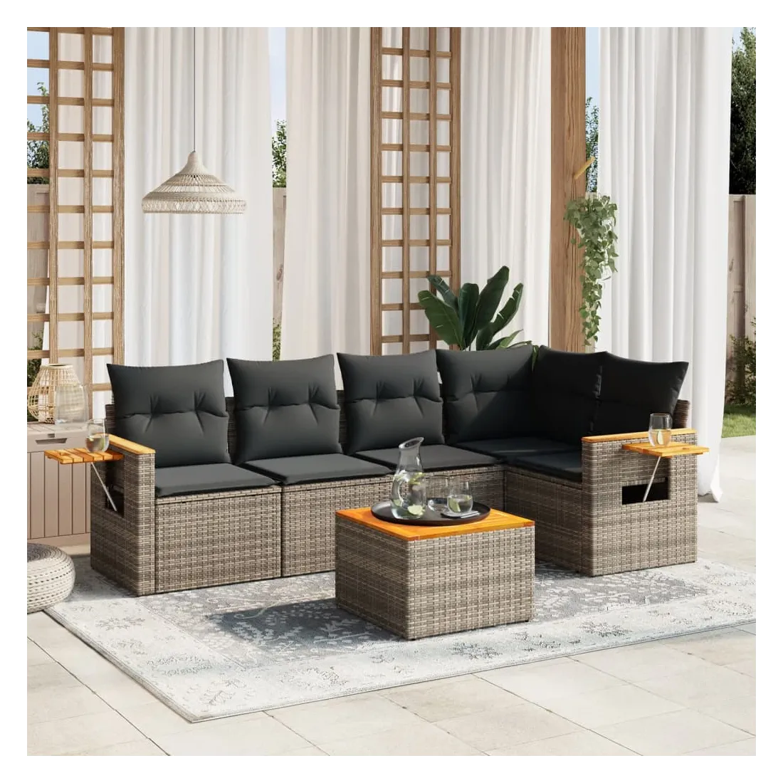 Cet ensemble de canapés de jardin est le complément parfait de votre arrière-cour, terrasse ou patio, offrant un espace confortable et accueillant pour discuter avec la famille et les amis ou simplement se détendre et profiter de l'extérieur. Matériau durable : la résine tressée, également connue sous le nom de poly rotin, est un matériau synthétique solide et nécessitant peu d'entretien qui ressemble au rotin naturel. Il est léger, facile à nettoyer et couramment utilisé pour les meubles d'extérieur en raison de sa durabilité et de ses propriétés de résistance aux intempéries.Fonction de rangement avec sac résistant à l'eau : le mobilier de jardin dispose d'un espace de rangement sous l'assise, complété par un sac résistant à l'eau pour ranger coussins, jouets et autres objets. Le sac intérieur peut être solidement fixé au mobilier d'extérieur grâce à des attaches auto-agrippantes pour plus de stabilité.Table d'appoint pratique : ce mobilier d'extérieur comprend une table d'appoint pliable avec un ressort à gaz sur les accoudoirs, offrant un endroit pratique pour garder vos essentiels à portée de main.Housse amovible et lavable : ces coussins de siège sont dotés de housses amovibles pour un lavage et un entretien faciles.Conception modulaire : cet ensemble de meubles d'extérieur a une conception modulaire, ce qui le rend complètement flexible et facile à déplacer, afin que vous puissiez créer un agencement de meubles d'extérieur personnalisé. Bon à savoir :Pour que vos meubles d'extérieur restent beaux, nous vous recommandons de les protéger avec une housse imperméable.