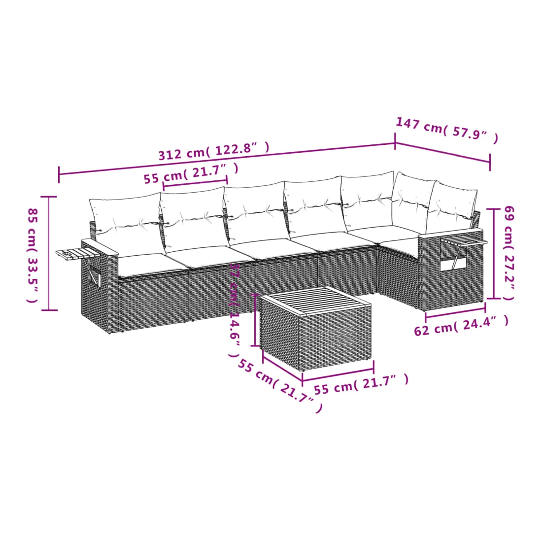 Cet ensemble de canapés de jardin est le complément parfait de votre arrière-cour, terrasse ou patio, offrant un espace confortable et accueillant pour discuter avec la famille et les amis ou simplement se détendre et profiter de l'extérieur. Matériau durable : la résine tressée, également connue sous le nom de poly rotin, est un matériau synthétique solide et nécessitant peu d'entretien qui ressemble au rotin naturel. Il est léger, facile à nettoyer et couramment utilisé pour les meubles d'extérieur en raison de sa durabilité et de ses propriétés de résistance aux intempéries.Fonction de rangement avec sac résistant à l'eau : le mobilier de jardin dispose d'un espace de rangement sous l'assise, complété par un sac résistant à l'eau pour ranger coussins, jouets et autres objets. Le sac intérieur peut être solidement fixé au mobilier d'extérieur grâce à des attaches auto-agrippantes pour plus de stabilité.Table d'appoint pratique : ce mobilier d'extérieur comprend une table d'appoint pliable avec un ressort à gaz sur les accoudoirs, offrant un endroit pratique pour garder vos essentiels à portée de main.Housse amovible et lavable : ces coussins de siège sont dotés de housses amovibles pour un lavage et un entretien faciles.Conception modulaire : cet ensemble de meubles d'extérieur a une conception modulaire, ce qui le rend complètement flexible et facile à déplacer, afin que vous puissiez créer un agencement de meubles d'extérieur personnalisé. Bon à savoir :Pour que vos meubles d'extérieur restent beaux, nous vous recommandons de les protéger avec une housse imperméable.