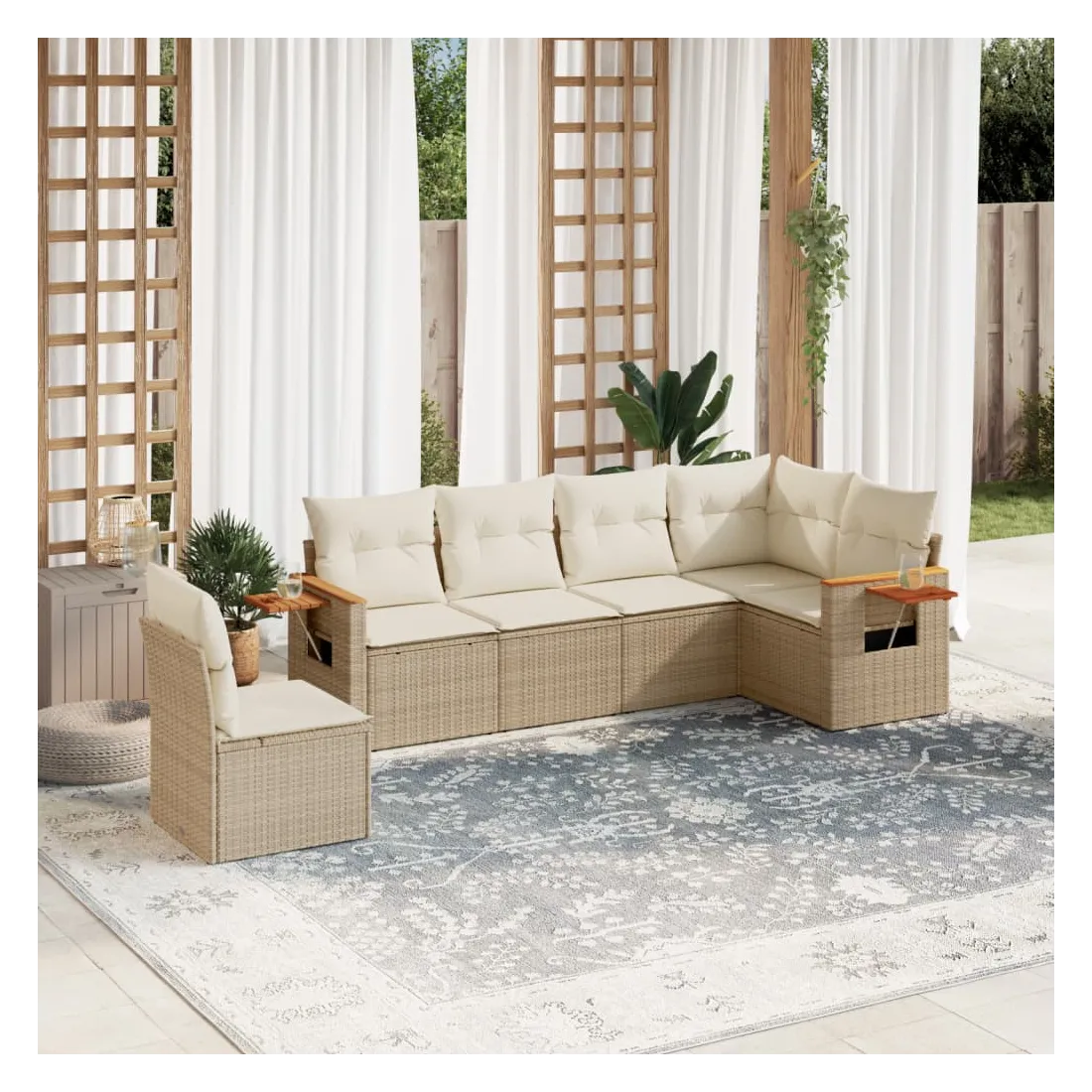 Cet ensemble de canapés de jardin est le complément parfait de votre arrière-cour, terrasse ou patio, offrant un espace confortable et accueillant pour discuter avec la famille et les amis ou simplement se détendre et profiter de l'extérieur. Matériau durable : la résine tressée, également connue sous le nom de poly rotin, est un matériau synthétique solide et nécessitant peu d'entretien qui ressemble au rotin naturel. Il est léger, facile à nettoyer et couramment utilisé pour les meubles d'extérieur en raison de sa durabilité et de ses propriétés de résistance aux intempéries.Fonction de rangement avec sac résistant à l'eau : le mobilier de jardin dispose d'un espace de rangement sous l'assise, complété par un sac résistant à l'eau pour ranger coussins, jouets et autres objets. Le sac intérieur peut être solidement fixé au mobilier d'extérieur grâce à des attaches auto-agrippantes pour plus de stabilité.Table d'appoint pratique : ce mobilier d'extérieur comprend une table d'appoint pliable avec un ressort à gaz sur les accoudoirs, offrant un endroit pratique pour garder vos essentiels à portée de main.Housse amovible et lavable : ces coussins de siège sont dotés de housses amovibles pour un lavage et un entretien faciles.Conception modulaire : cet ensemble de meubles d'extérieur a une conception modulaire, ce qui le rend complètement flexible et facile à déplacer, afin que vous puissiez créer un agencement de meubles d'extérieur personnalisé. Bon à savoir :Pour que vos meubles d'extérieur restent beaux, nous vous recommandons de les protéger avec une housse imperméable.