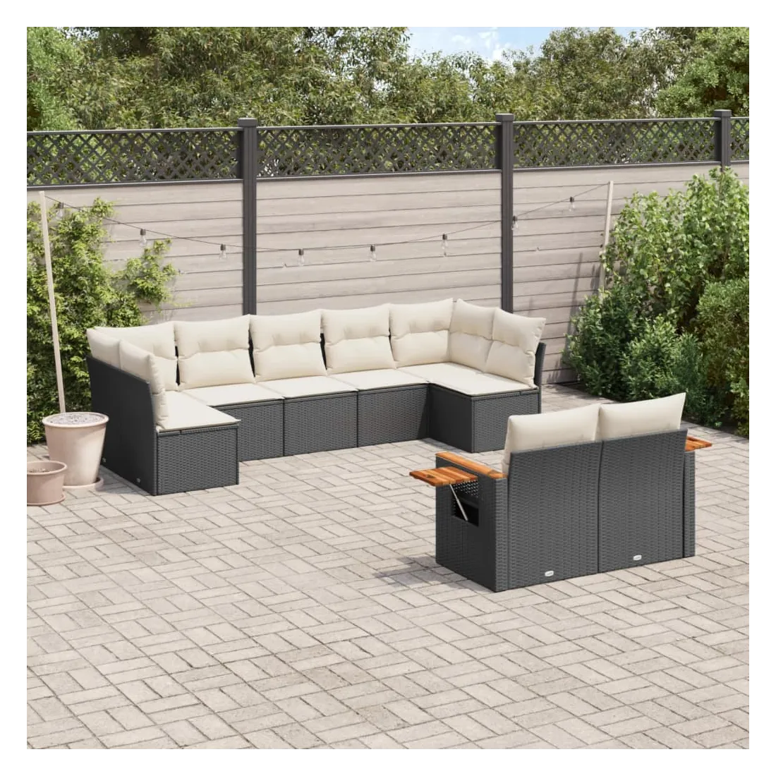 Cet ensemble de canapés de jardin est le complément parfait de votre arrière-cour, terrasse ou patio, offrant un espace confortable et accueillant pour discuter avec la famille et les amis ou simplement se détendre et profiter de l'extérieur. Matériau durable : la résine tressée, également connue sous le nom de poly rotin, est un matériau synthétique solide et nécessitant peu d'entretien qui ressemble au rotin naturel. Il est léger, facile à nettoyer et couramment utilisé pour les meubles d'extérieur en raison de sa durabilité et de ses propriétés de résistance aux intempéries.Fonction de rangement avec sac résistant à l'eau : le mobilier de jardin dispose d'un espace de rangement sous l'assise, complété par un sac résistant à l'eau pour ranger coussins, jouets et autres objets. Le sac intérieur peut être solidement fixé au mobilier d'extérieur grâce à des attaches auto-agrippantes pour plus de stabilité.Table d'appoint pratique : ce mobilier d'extérieur comprend une table d'appoint pliable avec un ressort à gaz sur les accoudoirs, offrant un endroit pratique pour garder vos essentiels à portée de main.Housse amovible et lavable : ces coussins de siège sont dotés de housses amovibles pour un lavage et un entretien faciles.Conception modulaire : cet ensemble de meubles d'extérieur a une conception modulaire, ce qui le rend complètement flexible et facile à déplacer, afin que vous puissiez créer un agencement de meubles d'extérieur personnalisé. Bon à savoir :Pour que vos meubles d'extérieur restent beaux, nous vous recommandons de les protéger avec une housse imperméable.