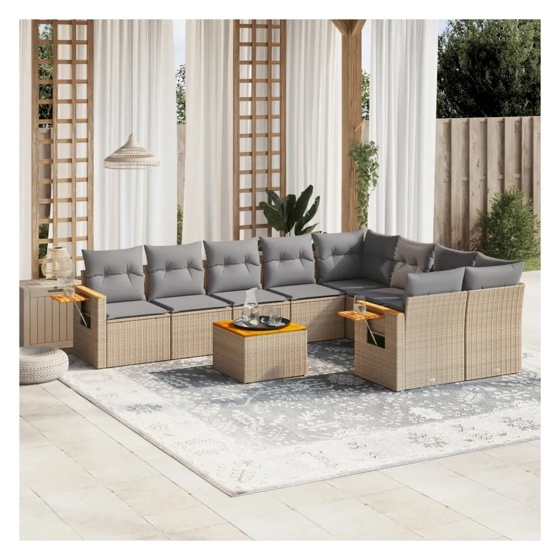 Cet ensemble de canapés de jardin est le complément parfait de votre arrière-cour, terrasse ou patio, offrant un espace confortable et accueillant pour discuter avec la famille et les amis ou simplement se détendre et profiter de l'extérieur. Matériau durable : la résine tressée, également connue sous le nom de poly rotin, est un matériau synthétique solide et nécessitant peu d'entretien qui ressemble au rotin naturel. Il est léger, facile à nettoyer et couramment utilisé pour les meubles d'extérieur en raison de sa durabilité et de ses propriétés de résistance aux intempéries.Fonction de rangement avec sac résistant à l'eau : le mobilier de jardin dispose d'un espace de rangement sous l'assise, complété par un sac résistant à l'eau pour ranger coussins, jouets et autres objets. Le sac intérieur peut être solidement fixé au mobilier d'extérieur grâce à des attaches auto-agrippantes pour plus de stabilité.Table d'appoint pratique : ce mobilier d'extérieur comprend une table d'appoint pliable avec un ressort à gaz sur les accoudoirs, offrant un endroit pratique pour garder vos essentiels à portée de main.Housse amovible et lavable : ces coussins de siège sont dotés de housses amovibles pour un lavage et un entretien faciles.Conception modulaire : cet ensemble de meubles d'extérieur a une conception modulaire, ce qui le rend complètement flexible et facile à déplacer, afin que vous puissiez créer un agencement de meubles d'extérieur personnalisé. Bon à savoir :Pour que vos meubles d'extérieur restent beaux, nous vous recommandons de les protéger avec une housse imperméable.