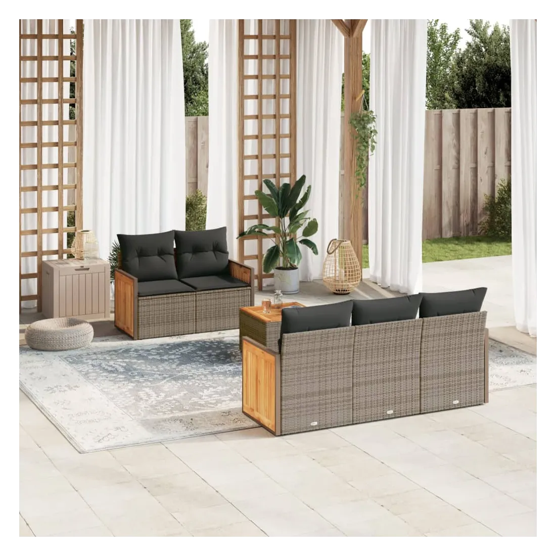 Cet ensemble de canapés de jardin est le complément parfait de votre arrière-cour, terrasse ou patio, offrant un espace confortable et accueillant pour discuter avec la famille et les amis ou simplement se détendre et profiter de l'extérieur. Matériau durable : la résine tressée, également connue sous le nom de poly rotin, est un matériau synthétique solide et nécessitant peu d'entretien qui ressemble au rotin naturel. Il est léger, facile à nettoyer et couramment utilisé pour les meubles d'extérieur en raison de sa durabilité et de ses propriétés de résistance aux intempéries.Fonction de rangement avec sac résistant à l'eau : le mobilier de jardin dispose d'un espace de rangement sous l'assise, complété par un sac résistant à l'eau pour ranger coussins, jouets et autres objets. Le sac intérieur peut être solidement fixé au mobilier d'extérieur grâce à des attaches auto-agrippantes pour plus de stabilité.Dessus stable et facile à nettoyer : cette table de jardin a un dessus en bois d'acacia robuste, durable et facile à nettoyer avec un chiffon humide.Housse amovible et lavable : ces coussins de siège sont dotés de housses amovibles pour un lavage et un entretien faciles.Conception modulaire : cet ensemble de meubles d'extérieur a une conception modulaire, ce qui le rend complètement flexible et facile à déplacer, afin que vous puissiez créer un agencement de meubles d'extérieur personnalisé. Bon à savoir :Pour que vos meubles d'extérieur restent beaux, nous vous recommandons de les protéger avec une housse imperméable.