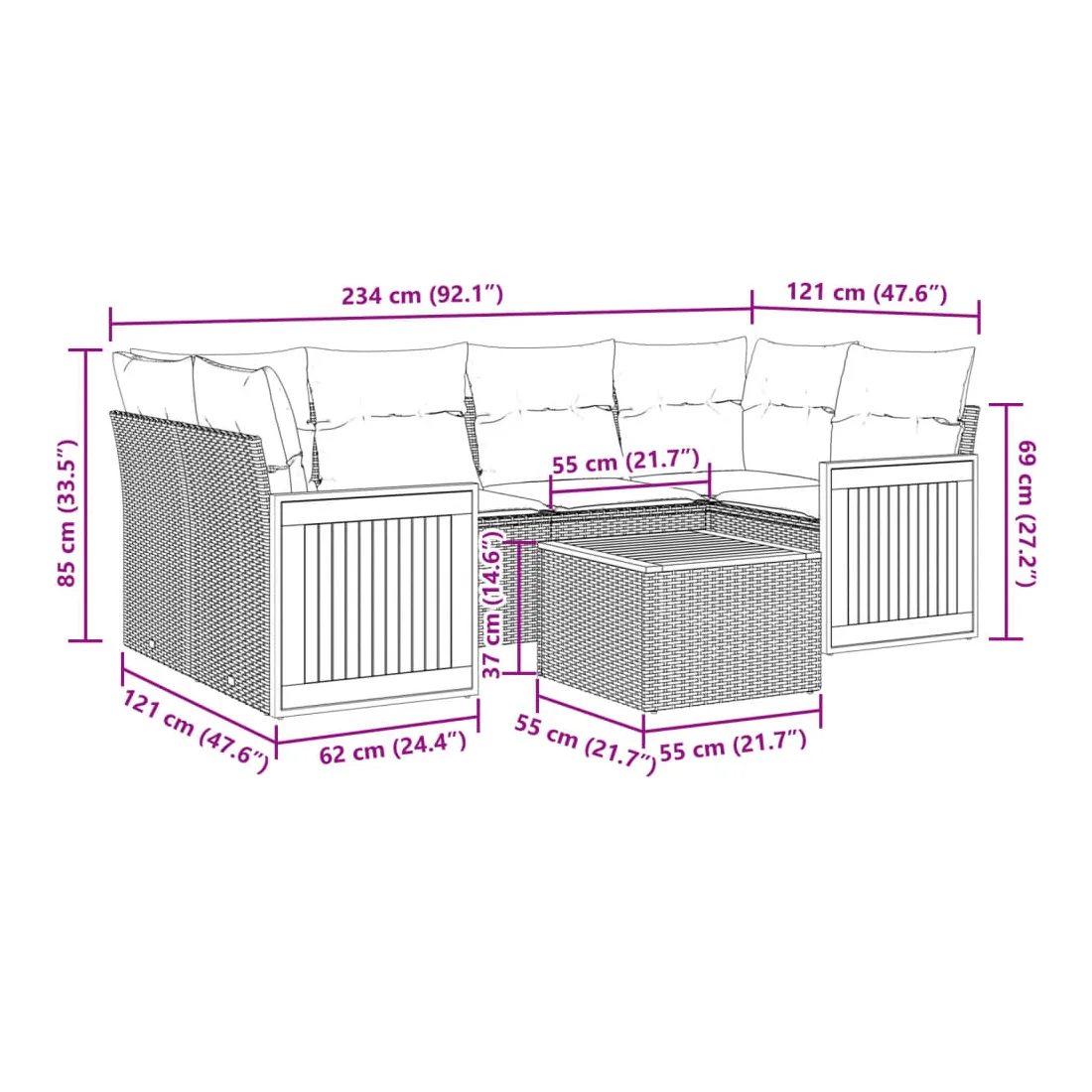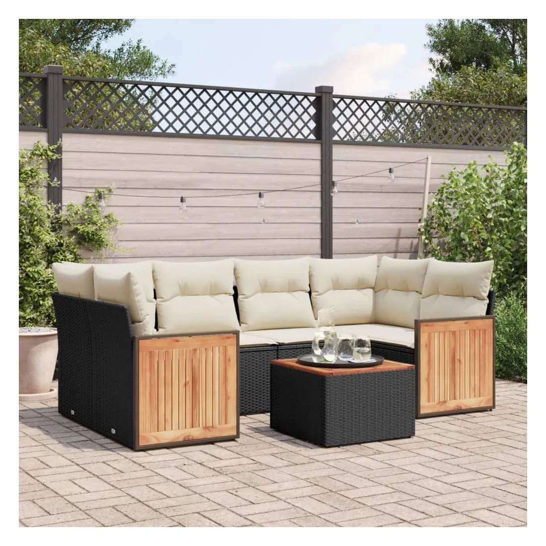 Cet ensemble de canapés de jardin est le complément parfait de votre arrière-cour, terrasse ou patio, offrant un espace confortable et accueillant pour discuter avec la famille et les amis ou simplement se détendre et profiter de l'extérieur. Matériau durable : la résine tressée, également connue sous le nom de poly rotin, est un matériau synthétique solide et nécessitant peu d'entretien qui ressemble au rotin naturel. Il est léger, facile à nettoyer et couramment utilisé pour les meubles d'extérieur en raison de sa durabilité et de ses propriétés de résistance aux intempéries.Fonction de rangement avec sac résistant à l'eau : le mobilier de jardin dispose d'un espace de rangement sous l'assise, complété par un sac résistant à l'eau pour ranger coussins, jouets et autres objets. Le sac intérieur peut être solidement fixé au mobilier d'extérieur grâce à des attaches auto-agrippantes pour plus de stabilité.Dessus stable et facile à nettoyer : cette table de jardin a un dessus en bois d'acacia robuste, durable et facile à nettoyer avec un chiffon humide.Housse amovible et lavable : ces coussins de siège sont dotés de housses amovibles pour un lavage et un entretien faciles.Conception modulaire : cet ensemble de meubles d'extérieur a une conception modulaire, ce qui le rend complètement flexible et facile à déplacer, afin que vous puissiez créer un agencement de meubles d'extérieur personnalisé. Bon à savoir :Pour que vos meubles d'extérieur restent beaux, nous vous recommandons de les protéger avec une housse imperméable.