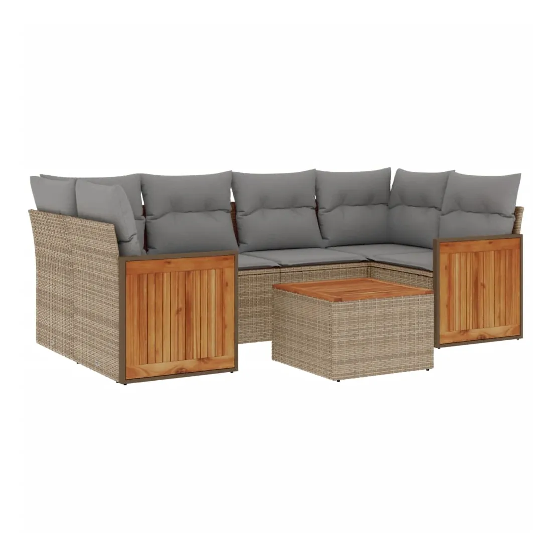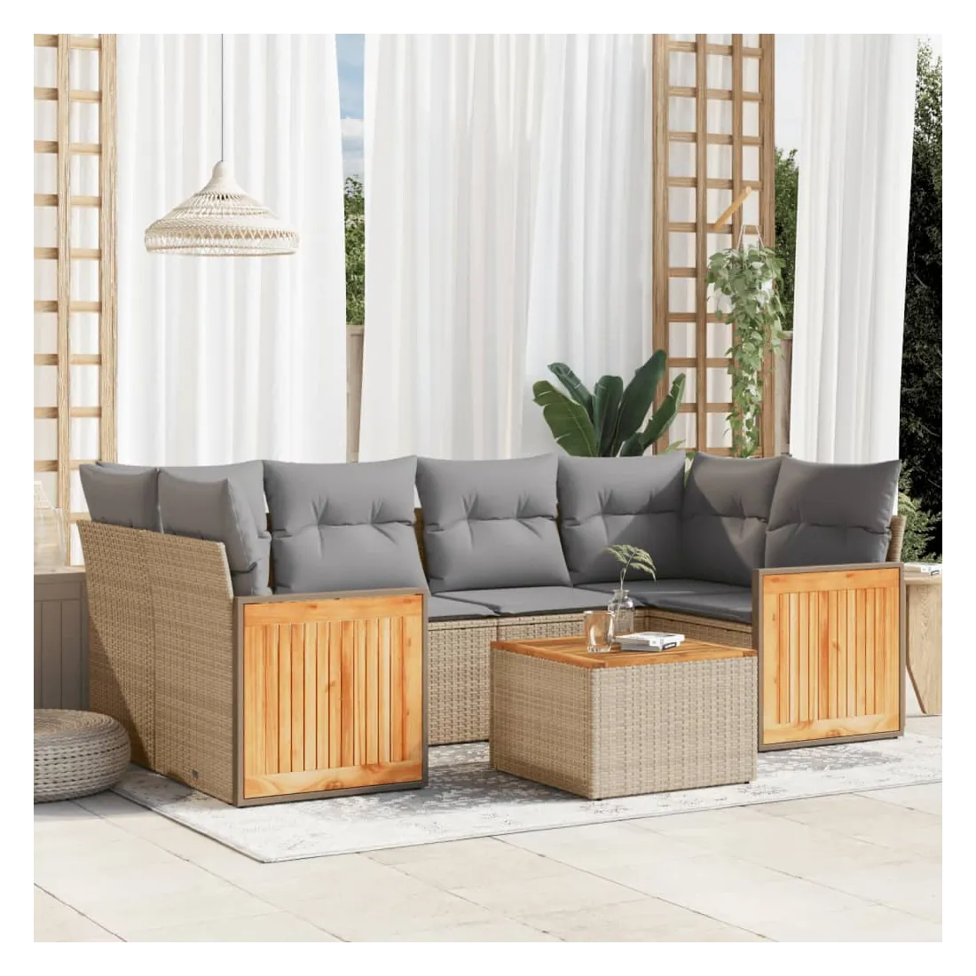 Cet ensemble de canapés de jardin est le complément parfait de votre arrière-cour, terrasse ou patio, offrant un espace confortable et accueillant pour discuter avec la famille et les amis ou simplement se détendre et profiter de l'extérieur. Matériau durable : la résine tressée, également connue sous le nom de poly rotin, est un matériau synthétique solide et nécessitant peu d'entretien qui ressemble au rotin naturel. Il est léger, facile à nettoyer et couramment utilisé pour les meubles d'extérieur en raison de sa durabilité et de ses propriétés de résistance aux intempéries.Fonction de rangement avec sac résistant à l'eau : le mobilier de jardin dispose d'un espace de rangement sous l'assise, complété par un sac résistant à l'eau pour ranger coussins, jouets et autres objets. Le sac intérieur peut être solidement fixé au mobilier d'extérieur grâce à des attaches auto-agrippantes pour plus de stabilité.Dessus stable et facile à nettoyer : cette table de jardin a un dessus en bois d'acacia robuste, durable et facile à nettoyer avec un chiffon humide.Housse amovible et lavable : ces coussins de siège sont dotés de housses amovibles pour un lavage et un entretien faciles.Conception modulaire : cet ensemble de meubles d'extérieur a une conception modulaire, ce qui le rend complètement flexible et facile à déplacer, afin que vous puissiez créer un agencement de meubles d'extérieur personnalisé. Bon à savoir :Pour que vos meubles d'extérieur restent beaux, nous vous recommandons de les protéger avec une housse imperméable.