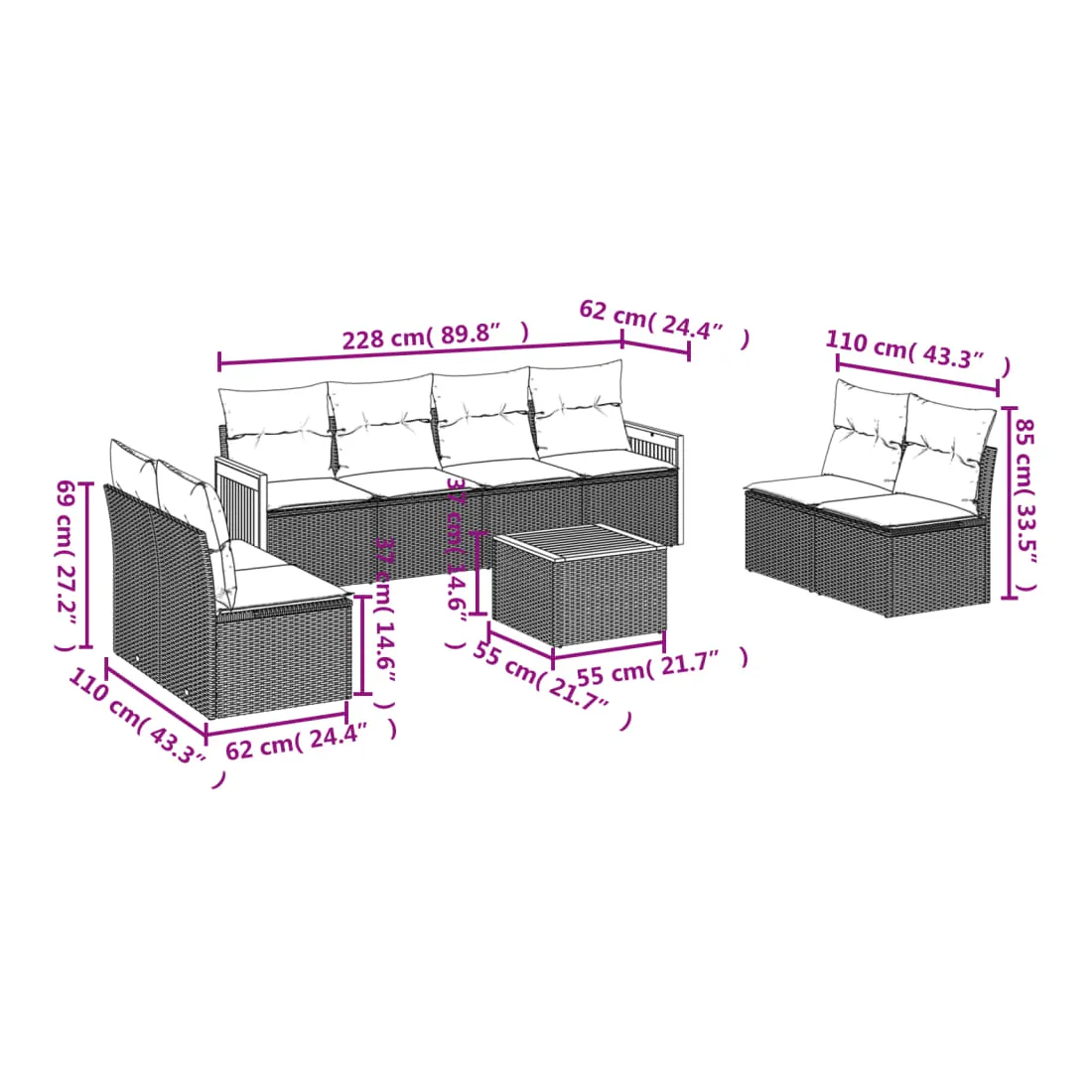 Cet ensemble de canapés de jardin est le complément parfait de votre arrière-cour, terrasse ou patio, offrant un espace confortable et accueillant pour discuter avec la famille et les amis ou simplement se détendre et profiter de l'extérieur. Matériau durable : la résine tressée, également connue sous le nom de poly rotin, est un matériau synthétique solide et nécessitant peu d'entretien qui ressemble au rotin naturel. Il est léger, facile à nettoyer et couramment utilisé pour les meubles d'extérieur en raison de sa durabilité et de ses propriétés de résistance aux intempéries.Fonction de rangement avec sac résistant à l'eau : le mobilier de jardin dispose d'un espace de rangement sous l'assise, complété par un sac résistant à l'eau pour ranger coussins, jouets et autres objets. Le sac intérieur peut être solidement fixé au mobilier d'extérieur grâce à des attaches auto-agrippantes pour plus de stabilité.Dessus stable et facile à nettoyer : cette table de jardin a un dessus en bois d'acacia robuste, durable et facile à nettoyer avec un chiffon humide.Housse amovible et lavable : ces coussins de siège sont dotés de housses amovibles pour un lavage et un entretien faciles.Conception modulaire : cet ensemble de meubles d'extérieur a une conception modulaire, ce qui le rend complètement flexible et facile à déplacer, afin que vous puissiez créer un agencement de meubles d'extérieur personnalisé. Bon à savoir :Pour que vos meubles d'extérieur restent beaux, nous vous recommandons de les protéger avec une housse imperméable.