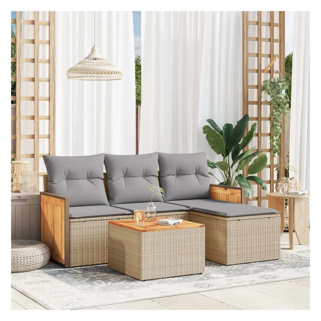 Cet ensemble de canapés de jardin est le complément parfait de votre arrière-cour, terrasse ou patio, offrant un espace confortable et accueillant pour discuter avec la famille et les amis ou simplement se détendre et profiter de l'extérieur. Matériau durable : la résine tressée, également connue sous le nom de poly rotin, est un matériau synthétique solide et nécessitant peu d'entretien qui ressemble au rotin naturel. Il est léger, facile à nettoyer et couramment utilisé pour les meubles d'extérieur en raison de sa durabilité et de ses propriétés de résistance aux intempéries.Fonction de rangement avec sac résistant à l'eau : le mobilier de jardin dispose d'un espace de rangement sous l'assise, complété par un sac résistant à l'eau pour ranger coussins, jouets et autres objets. Le sac intérieur peut être solidement fixé au mobilier d'extérieur grâce à des attaches auto-agrippantes pour plus de stabilité.Dessus stable et facile à nettoyer : cette table de jardin a un dessus en bois d'acacia robuste, durable et facile à nettoyer avec un chiffon humide.Housse amovible et lavable : ces coussins de siège sont dotés de housses amovibles pour un lavage et un entretien faciles.Conception modulaire : cet ensemble de meubles d'extérieur a une conception modulaire, ce qui le rend complètement flexible et facile à déplacer, afin que vous puissiez créer un agencement de meubles d'extérieur personnalisé. Bon à savoir :Pour que vos meubles d'extérieur restent beaux, nous vous recommandons de les protéger avec une housse imperméable.
