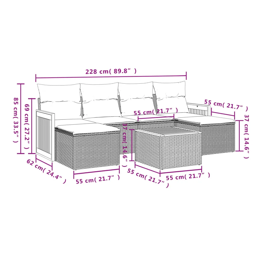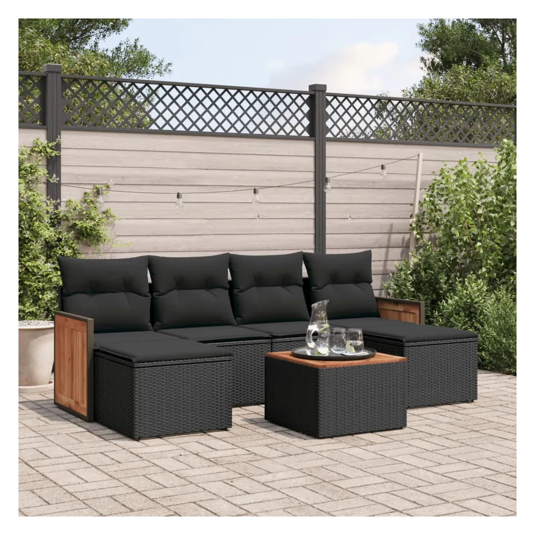 Cet ensemble de canapés de jardin est le complément parfait de votre arrière-cour, terrasse ou patio, offrant un espace confortable et accueillant pour discuter avec la famille et les amis ou simplement se détendre et profiter de l'extérieur. Matériau durable : la résine tressée, également connue sous le nom de poly rotin, est un matériau synthétique solide et nécessitant peu d'entretien qui ressemble au rotin naturel. Il est léger, facile à nettoyer et couramment utilisé pour les meubles d'extérieur en raison de sa durabilité et de ses propriétés de résistance aux intempéries.Fonction de rangement avec sac résistant à l'eau : le mobilier de jardin dispose d'un espace de rangement sous l'assise, complété par un sac résistant à l'eau pour ranger coussins, jouets et autres objets. Le sac intérieur peut être solidement fixé au mobilier d'extérieur grâce à des attaches auto-agrippantes pour plus de stabilité.Dessus stable et facile à nettoyer : cette table de jardin a un dessus en bois d'acacia robuste, durable et facile à nettoyer avec un chiffon humide.Housse amovible et lavable : ces coussins de siège sont dotés de housses amovibles pour un lavage et un entretien faciles.Conception modulaire : cet ensemble de meubles d'extérieur a une conception modulaire, ce qui le rend complètement flexible et facile à déplacer, afin que vous puissiez créer un agencement de meubles d'extérieur personnalisé. Bon à savoir :Pour que vos meubles d'extérieur restent beaux, nous vous recommandons de les protéger avec une housse imperméable.