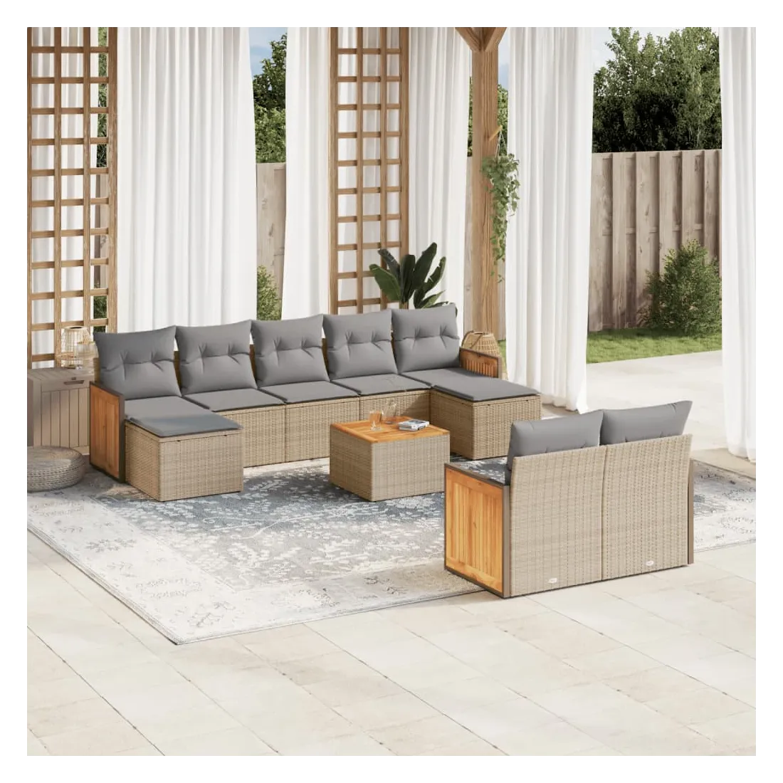 Cet ensemble de canapés de jardin est le complément parfait de votre arrière-cour, terrasse ou patio, offrant un espace confortable et accueillant pour discuter avec la famille et les amis ou simplement se détendre et profiter de l'extérieur. Matériau durable : la résine tressée, également connue sous le nom de poly rotin, est un matériau synthétique solide et nécessitant peu d'entretien qui ressemble au rotin naturel. Il est léger, facile à nettoyer et couramment utilisé pour les meubles d'extérieur en raison de sa durabilité et de ses propriétés de résistance aux intempéries.Fonction de rangement avec sac résistant à l'eau : le mobilier de jardin dispose d'un espace de rangement sous l'assise, complété par un sac résistant à l'eau pour ranger coussins, jouets et autres objets. Le sac intérieur peut être solidement fixé au mobilier d'extérieur grâce à des attaches auto-agrippantes pour plus de stabilité.Dessus stable et facile à nettoyer : cette table de jardin a un dessus en bois d'acacia robuste, durable et facile à nettoyer avec un chiffon humide.Housse amovible et lavable : ces coussins de siège sont dotés de housses amovibles pour un lavage et un entretien faciles.Conception modulaire : cet ensemble de meubles d'extérieur a une conception modulaire, ce qui le rend complètement flexible et facile à déplacer, afin que vous puissiez créer un agencement de meubles d'extérieur personnalisé. Bon à savoir :Pour que vos meubles d'extérieur restent beaux, nous vous recommandons de les protéger avec une housse imperméable.