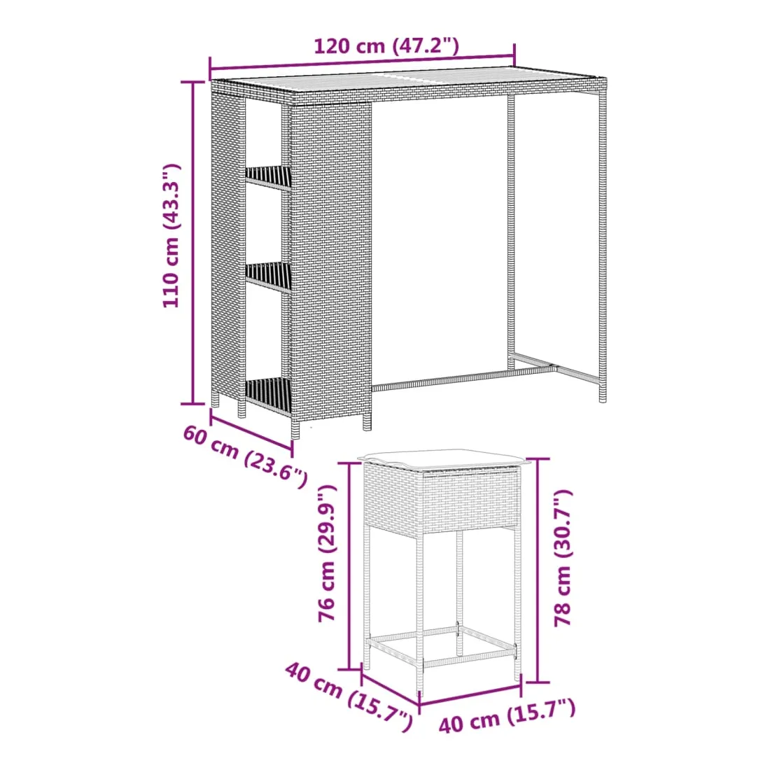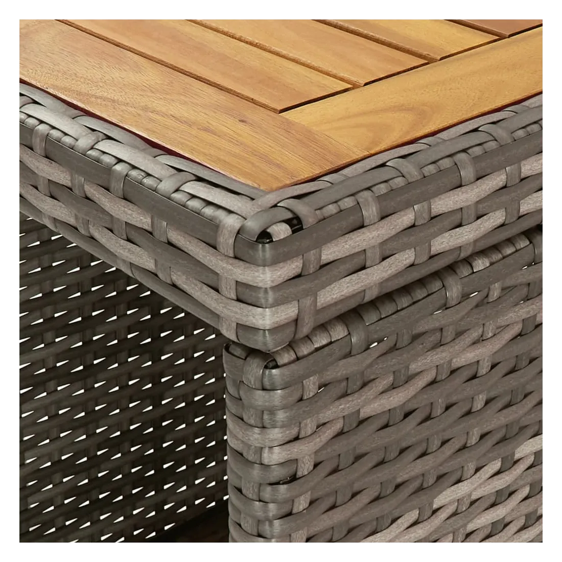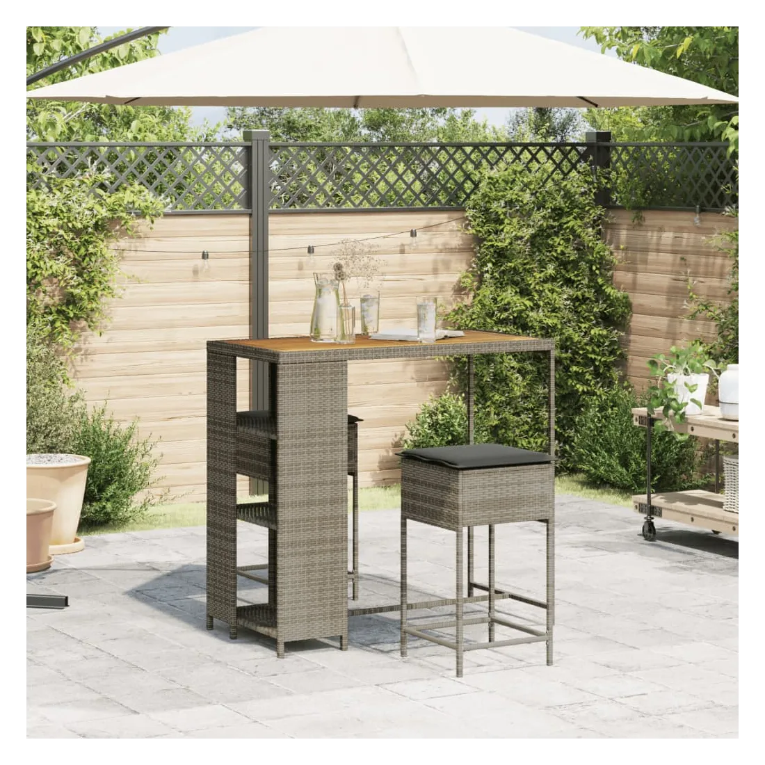 vidaXLCet ensemble de bar de jardin tendance, combinant à la fois style et fonctionnalité, est sûrement destiné à être la pièce maîtresse de votre jardin, terrasse et de tout autre espace de vie. Matériau durable : la résine tressée, également connue sous le nom de poly rotin, est un matériau synthétique solide et nécessitant peu d'entretien qui ressemble au rotin naturel. Elle est légère, facile à nettoyer et couramment utilisée pour les meubles d'extérieur en raison de sa durabilité et de ses propriétés de résistance aux intempéries.Expérience d'assise confortable : ce mobilier d'extérieur, doté de coussins épais, offre une expérience d'assise confortable.Housse amovible et lavable : ces coussins de siège sont dotés de housses amovibles pour un lavage et un entretien faciles.Dessus stable et facile à nettoyer : cette table de jardin a un dessus en bois d'acacia robuste, durable et facile à nettoyer avec un chiffon humide.Cadre robuste et stable : le cadre en acier enduit de poudre assure la solidité et la stabilité du meuble de jardin pour une utilisation quotidienne à l'extérieur. Bon à savoir :Pour que vos meubles d'extérieur restent beaux, nous vous recommandons de les protéger avec une housse imperméable.