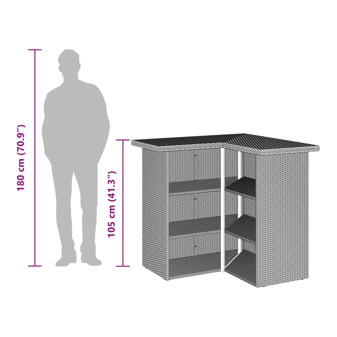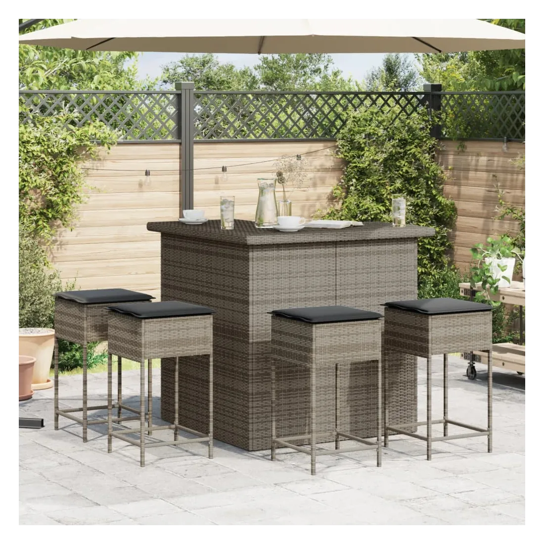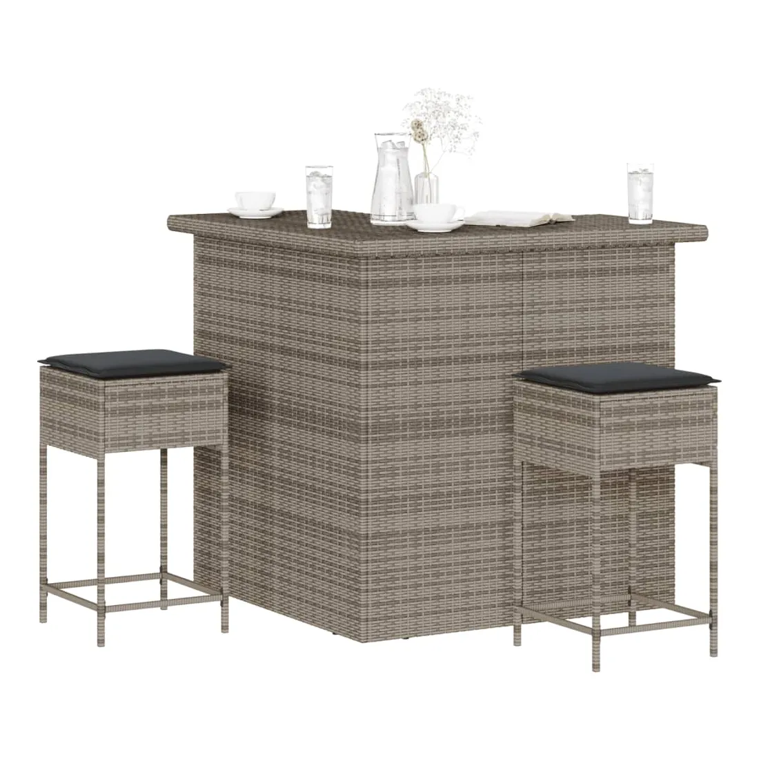 vidaXLCet ensemble de bar de jardin tendance, combinant à la fois style et fonctionnalité, est sûrement destiné à être la pièce maîtresse de votre jardin, terrasse et de tout autre espace de vie. Matériau durable : la résine tressée, également connue sous le nom de poly rotin, est un matériau synthétique solide et nécessitant peu d'entretien qui ressemble au rotin naturel. Elle est légère, facile à nettoyer et couramment utilisée pour les meubles d'extérieur en raison de sa durabilité et de ses propriétés de résistance aux intempéries.Expérience d'assise confortable : ce mobilier d'extérieur, doté de coussins épais, offre une expérience d'assise confortable.Housse amovible et lavable : ces coussins de siège sont dotés de housses amovibles pour un lavage et un entretien faciles.Cadre robuste et stable : le cadre en acier enduit de poudre assure la solidité et la stabilité du meuble de jardin pour une utilisation quotidienne à l'extérieur. Bon à savoir :Pour que vos meubles d'extérieur restent beaux, nous vous recommandons de les protéger avec une housse imperméable.