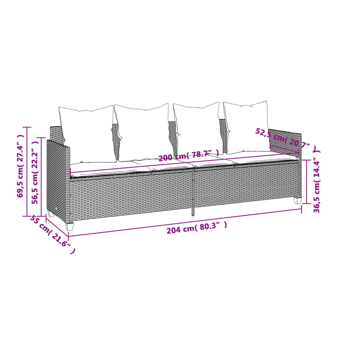 - Taille du coussin d’assise (canapé 4 places) : 200 x 52,5 x 3 cm (l x P x é)