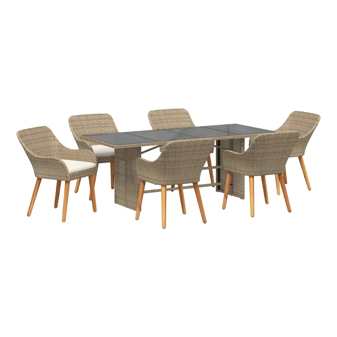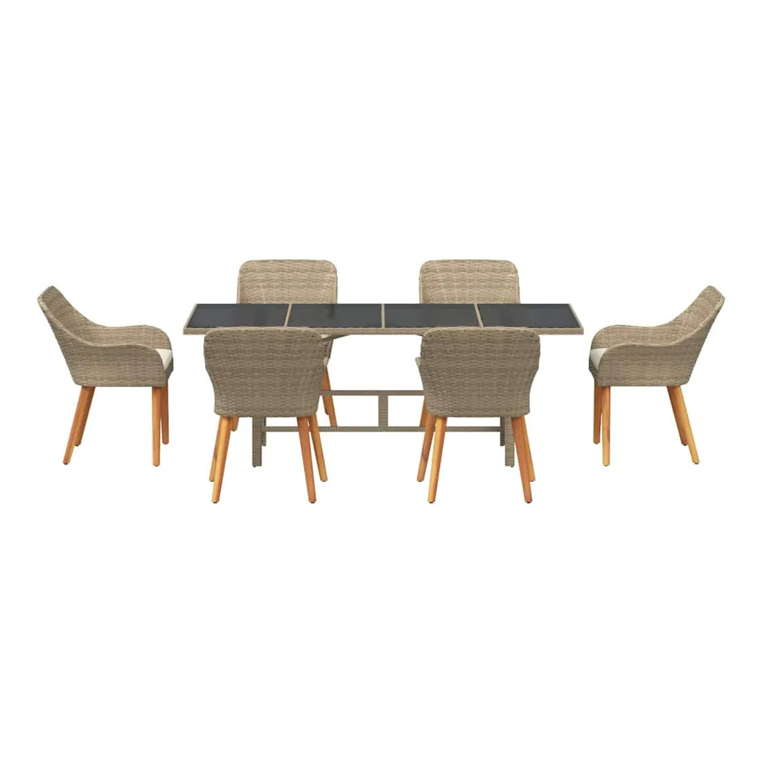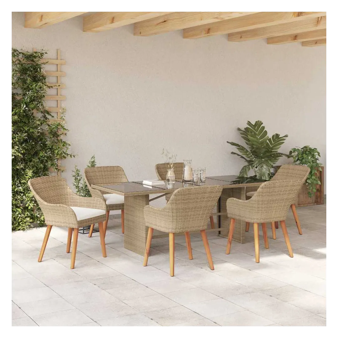 Cet ensemble de salle à manger de jardin stylé est parfait pour améliorer vos moments dehors tout en ajoutant une touche de confort. Super pour les jardins et terrasses, il combine un design moderne avec des aspects pratiques pour créer un coin repas sympa pour vos soirées en plein air. Avec ses lignes simples et son style minimaliste, cet ensemble s’adapte à plein de thèmes décoratifs tout en offrant confort et performance. Son design séduisant et sa nature accueillante en font un choix populaire pour les propriétaires qui cherchent une solution agréable mais classe pour manger à l'extérieur. Matériaux de qualité supérieure L'ensemble de salle à manger est entièrement construit en Poly Rattan, connu pour sa solidité et son allure esthétique. La résistance aux UV du matériau permet une durabilité, gardant sa couleur éclatante même au soleil. L'acier est recouvert de poudre pour plus de solidité, créant un cadre qui résiste facilement aux intempéries. Ensemble complet Chaque siège a un dossier confortable et des accoudoirs en Poly Rattan, offrant un confort ergonomique pour vos repas. Tous les éléments, des sièges au cadre de la table, créent une ambiance agréable pour discuter et se détendre. Fonctionnalité moderne Les lignes modernes et épurées de l'ensemble de salle à manger combinent simplicité et raffinement. Sa conception adaptable le rend parfait pour les espaces extérieurs contemporains tout en restant fonctionnel sans être compliqué. Il représente l'essence du design de meubles tendance. Usages polyvalents Parfait pour des déjeuners en plein air, des rencontres décontractées ou même un café tranquille en solo. Il passe facilement de dîners intimes à un coin reposant, s'adaptant à toutes les occasions et états d'esprit. La polyvalence de cet ensemble souligne sa grande valeur. Entretien simple Garder ce mobilier en bon état est facile : un coup de chiffon humide suffit. Un entretien régulier prolongera la durée de vie et maintiendra son look impeccable, offrant une grande praticité à l'utilisateur.