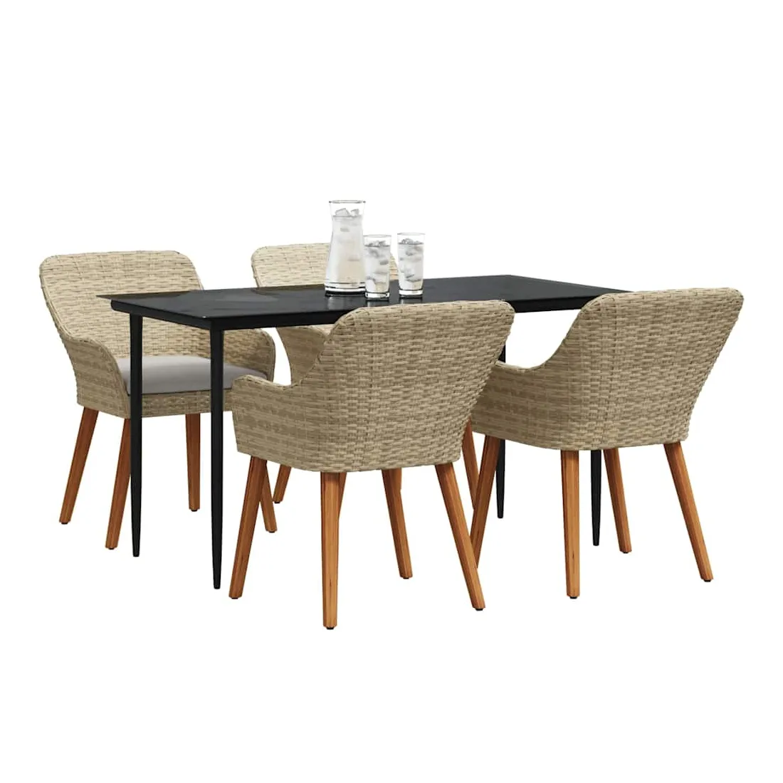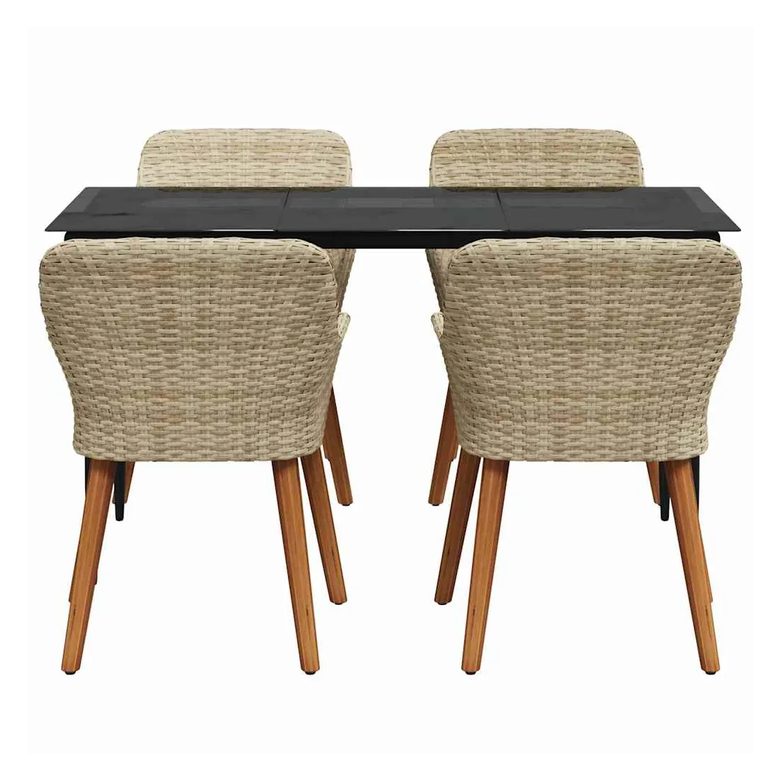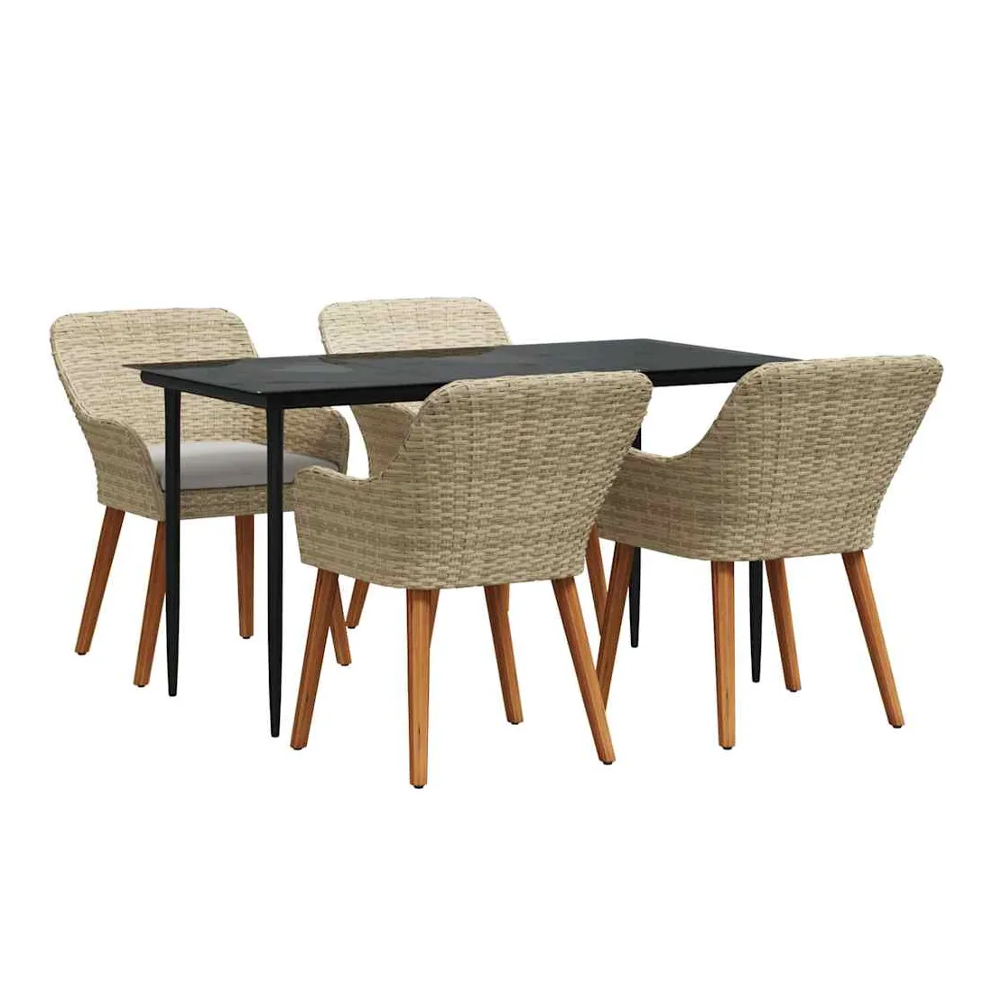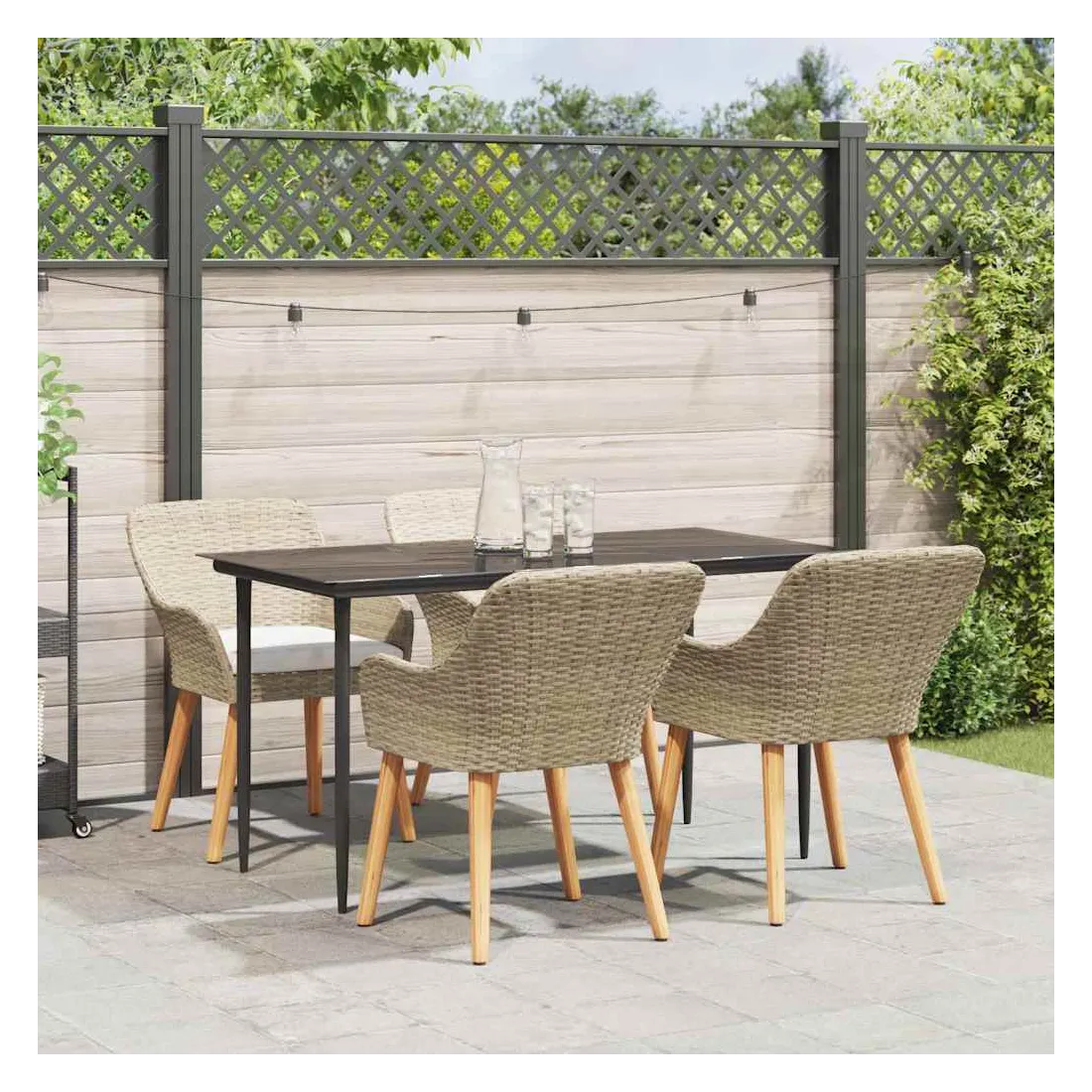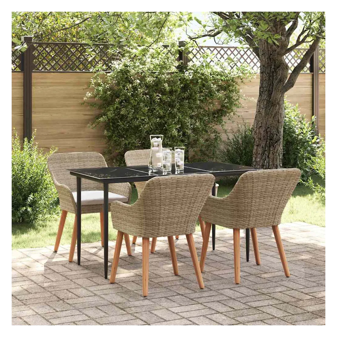 Le set de salle à manger de jardin est un super ajout à n'importe quel espace extérieur, avec un style moderne et des lignes épurées qui attirent l'œil. Réalisé pour ceux qui veulent le meilleur, cet ensemble allie perfection et style, idéal pour passer de bons moments dans votre jardin ou sur votre terrasse. Son look chic transforme votre extérieur en un endroit cool pour dîner et se relaxer. Matériau en poly rattan : Le set de salle à manger pour le jardin est fait en poly rattan, connu pour sa durabilité et son faible entretien. Ce matériau résiste aux intempéries, ce qui garantit que votre ensemble reste beau même après une utilisation extérieure. La texture du rattan apporte une touche classe à tout ensemble de jardin. Surface en verre trempé : La table est recouverte de verre trempé, ce qui offre une expérience de repas lisse. Le verre est facile à nettoyer, reste clair malgré le temps qu'il fait et ajoute une finition moderne qui complète bien le rattan. Confort total : Cet ensemble vient avec des coussins rembourrés conçus pour l'extérieur et résistants au mauvais temps, garantissant du confort même par temps difficile. Pensés pour le bien-être, les coussins s'adaptent bien aux chaises et visent à maximiser votre confort. Composants pratiques : La finition du dossier en poly rattan, avec des accoudoirs stables, crée une ambiance accueillante et ergonomique. Chaque élément a été soigneusement intégré pour rendre vos repas inoubliables. Entretien et maintenance : Conçu pour un entretien facile, il suffit de passer un coup de chiffon humide pour garder l'ensemble en top état. On vous conseille d'utiliser une housse étanche pour prolonger sa durabilité et garder son look au fil du temps.