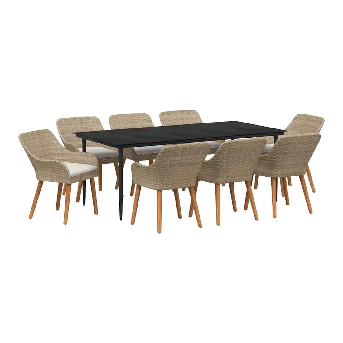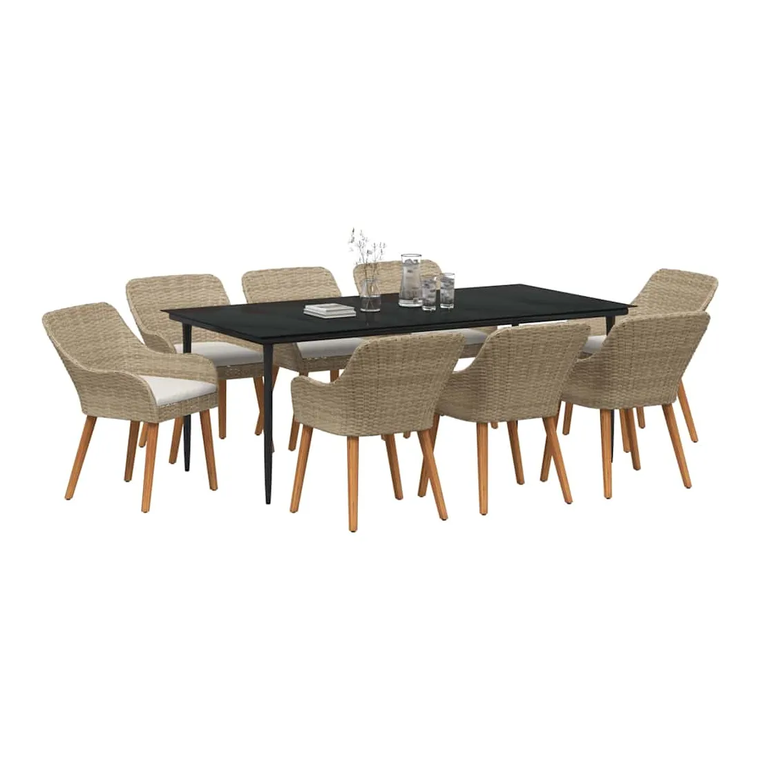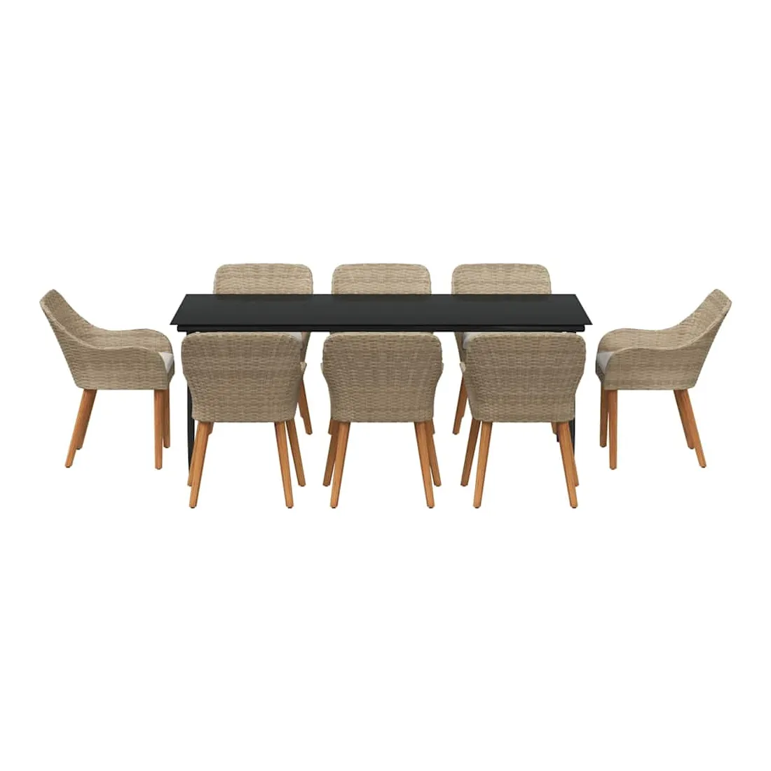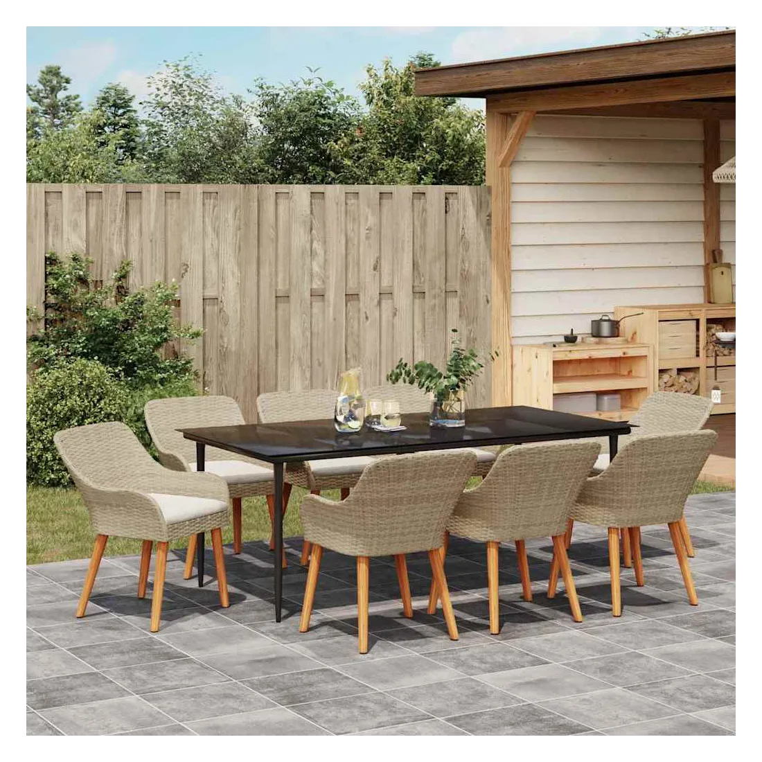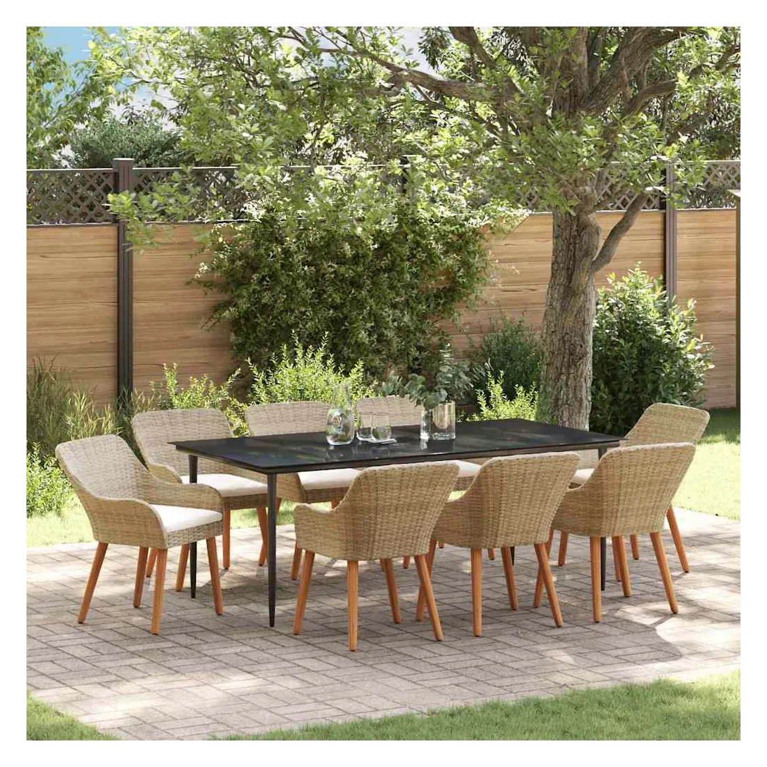 Le set de salle à manger de jardin est un super ajout à n'importe quel espace extérieur, avec un style moderne et des lignes épurées qui attirent l'œil. Réalisé pour ceux qui veulent le meilleur, cet ensemble allie perfection et style, idéal pour passer de bons moments dans votre jardin ou sur votre terrasse. Son look chic transforme votre extérieur en un endroit cool pour dîner et se relaxer. Matériau en poly rattan : Le set de salle à manger pour le jardin est fait en poly rattan, connu pour sa durabilité et son faible entretien. Ce matériau résiste aux intempéries, ce qui garantit que votre ensemble reste beau même après une utilisation extérieure. La texture du rattan apporte une touche classe à tout ensemble de jardin. Surface en verre trempé : La table est recouverte de verre trempé, ce qui offre une expérience de repas lisse. Le verre est facile à nettoyer, reste clair malgré le temps qu'il fait et ajoute une finition moderne qui complète bien le rattan. Confort total : Cet ensemble vient avec des coussins rembourrés conçus pour l'extérieur et résistants au mauvais temps, garantissant du confort même par temps difficile. Pensés pour le bien-être, les coussins s'adaptent bien aux chaises et visent à maximiser votre confort. Composants pratiques : La finition du dossier en poly rattan, avec des accoudoirs stables, crée une ambiance accueillante et ergonomique. Chaque élément a été soigneusement intégré pour rendre vos repas inoubliables. Entretien et maintenance : Conçu pour un entretien facile, il suffit de passer un coup de chiffon humide pour garder l'ensemble en top état. On vous conseille d'utiliser une housse étanche pour prolonger sa durabilité et garder son look au fil du temps.