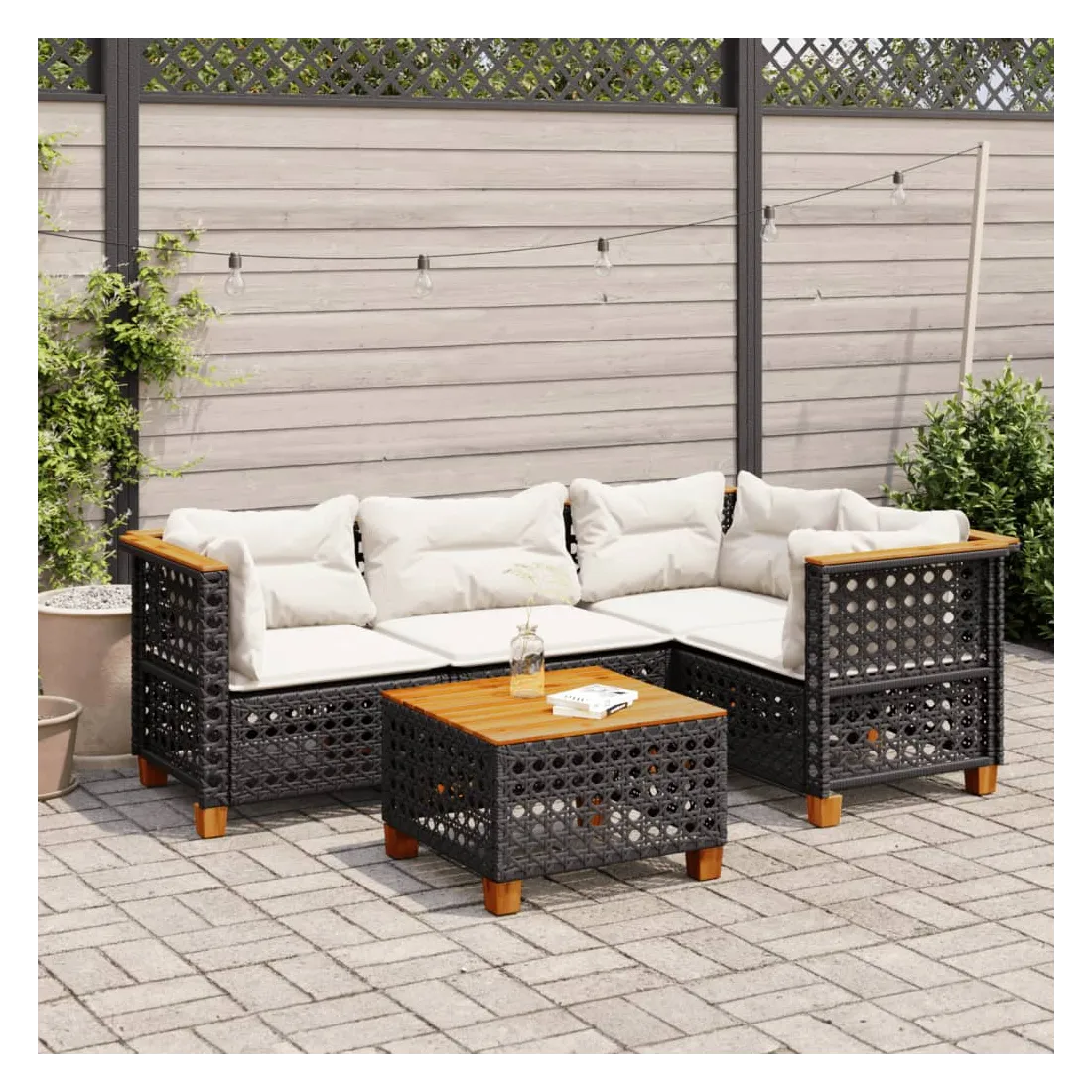 Cet ensemble de canapés de jardin est le complément parfait de votre arrière-cour, terrasse ou patio, offrant un espace confortable et accueillant pour discuter avec la famille et les amis ou simplement se détendre et profiter de l'extérieur. Matériau durable : la résine tressée, également connue sous le nom de poly rotin, est un matériau synthétique solide et nécessitant peu d'entretien qui ressemble au rotin naturel. Il est léger, facile à nettoyer et couramment utilisé pour les meubles d'extérieur en raison de sa durabilité et de ses propriétés de résistance aux intempéries.Expérience d'assise confortable : ce mobilier d'extérieur, doté de coussins épais, offre une expérience d'assise confortable.Housse amovible et lavable : ces coussins de siège sont dotés de housses amovibles pour un lavage et un entretien faciles.Dessus stable et facile à nettoyer : cette table de jardin a un dessus en bois d'acacia robuste, durable et facile à nettoyer avec un chiffon humide.Conception modulaire : cet ensemble de meubles d'extérieur a une conception modulaire, ce qui le rend complètement flexible et facile à déplacer, afin que vous puissiez créer un agencement de meubles d'extérieur personnalisé. Bon à savoir :Pour que vos meubles d'extérieur restent beaux, nous vous recommandons de les protéger avec une housse imperméable.