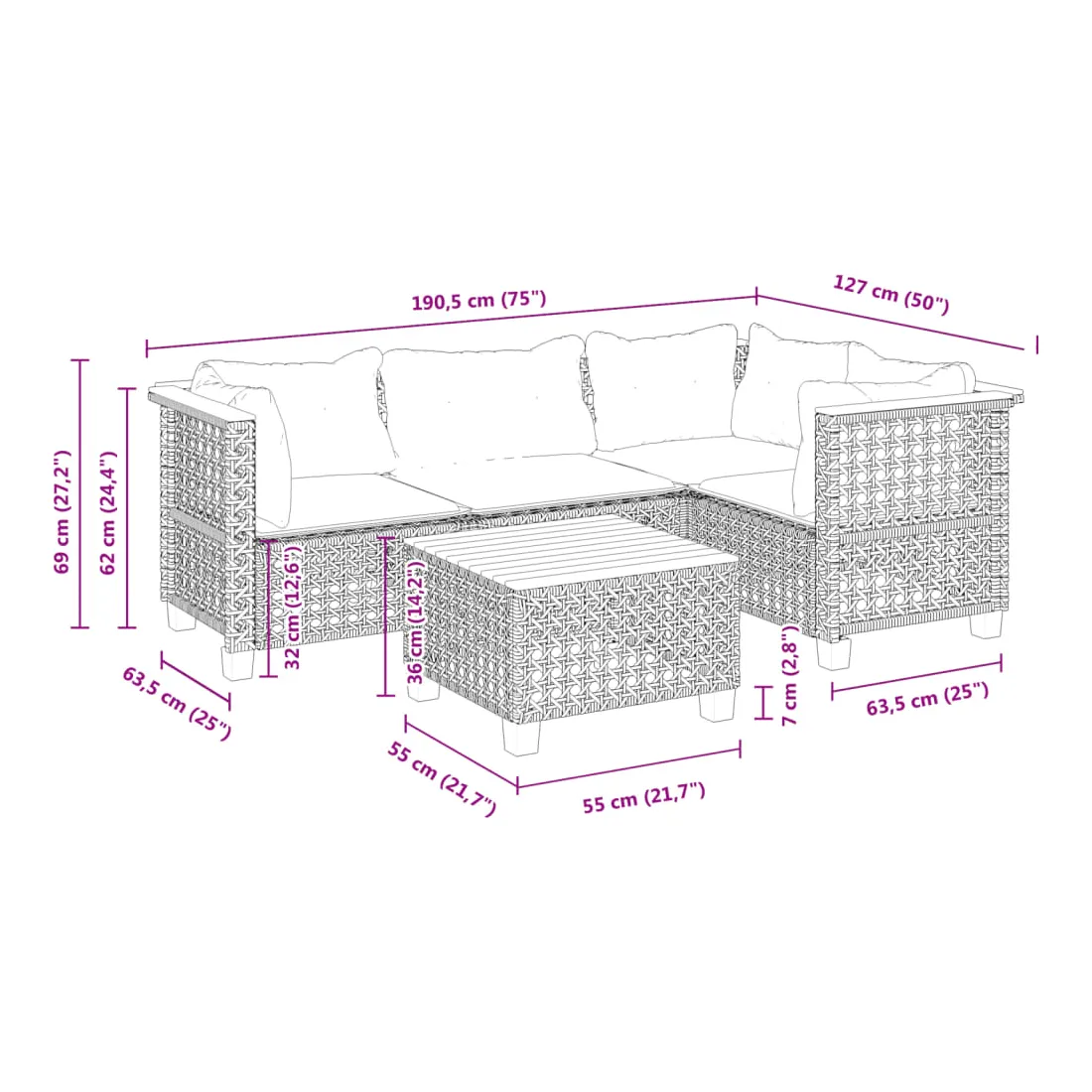 - Dimensions du coussin de dossier (angle) : 63,5 x 35 x 10 cm (L x l x é)