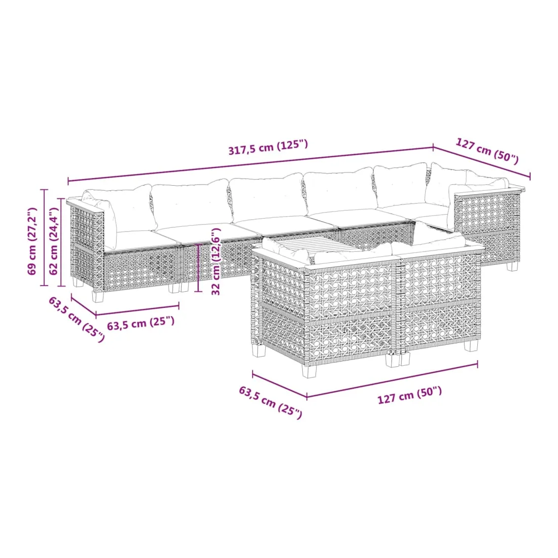 - Hauteur du siège à partir du sol (sans coussin) : 32 cm