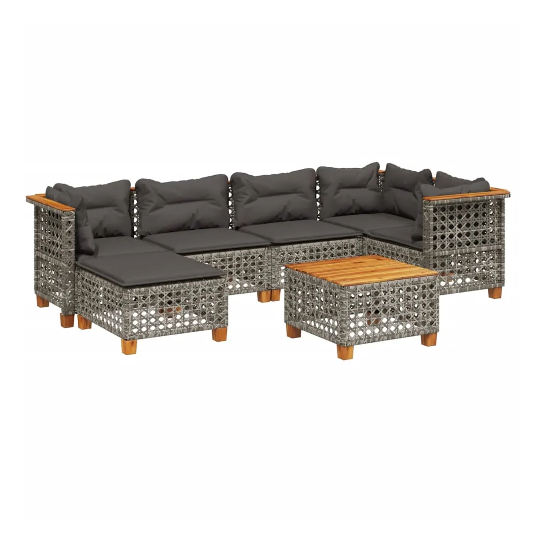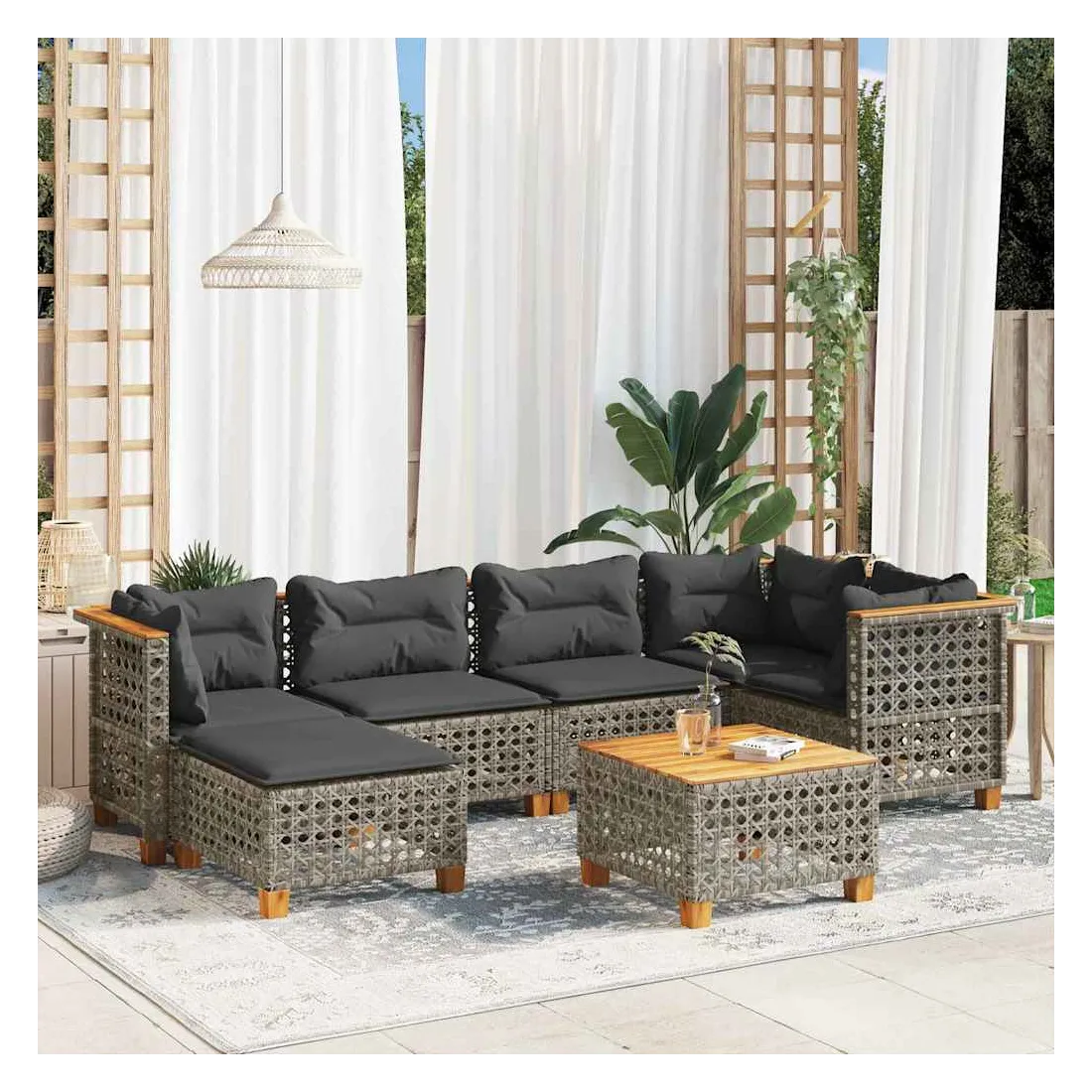 Cet ensemble de canapés de jardin est le complément parfait de votre arrière-cour, terrasse ou patio, offrant un espace confortable et accueillant pour discuter avec la famille et les amis ou simplement se détendre et profiter de l'extérieur. Matériau durable : la résine tressée, également connue sous le nom de poly rotin, est un matériau synthétique solide et nécessitant peu d'entretien qui ressemble au rotin naturel. Il est léger, facile à nettoyer et couramment utilisé pour les meubles d'extérieur en raison de sa durabilité et de ses propriétés de résistance aux intempéries.Expérience d'assise confortable : ce mobilier d'extérieur, doté de coussins épais, offre une expérience d'assise confortable.Housse amovible et lavable : ces coussins de siège sont dotés de housses amovibles pour un lavage et un entretien faciles.Dessus stable et facile à nettoyer : cette table de jardin a un dessus en bois d'acacia robuste, durable et facile à nettoyer avec un chiffon humide.Conception modulaire : cet ensemble de meubles d'extérieur a une conception modulaire, ce qui le rend complètement flexible et facile à déplacer, afin que vous puissiez créer un agencement de meubles d'extérieur personnalisé. Bon à savoir :Pour que vos meubles d'extérieur restent beaux, nous vous recommandons de les protéger avec une housse imperméable.