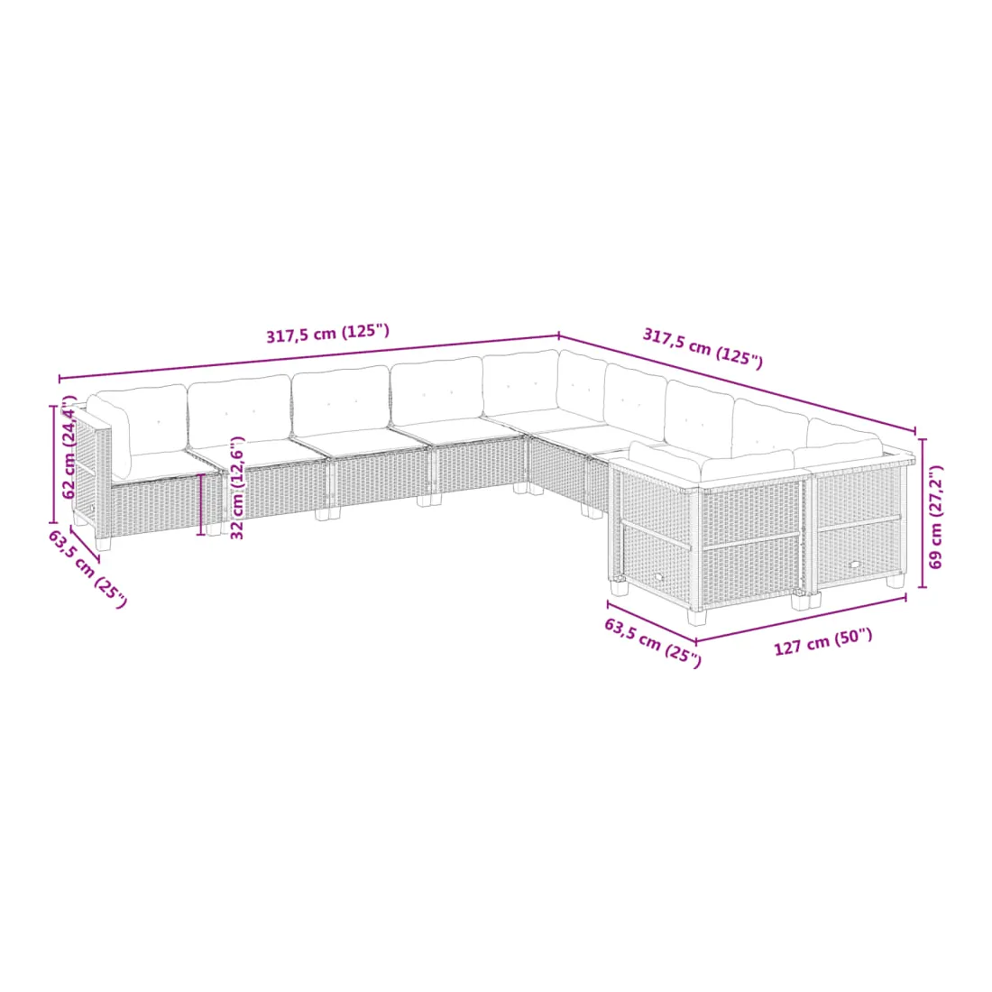 • Dimensions du coussin de dossier (angle) : 63,5 x 35 x 10 cm (L x l x é)