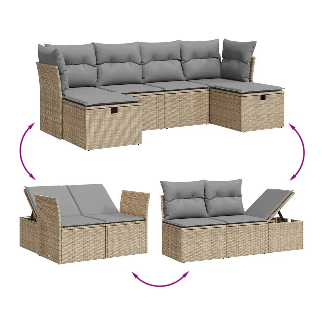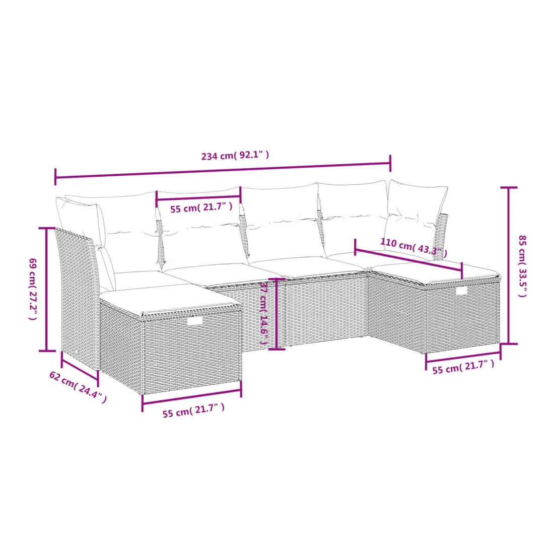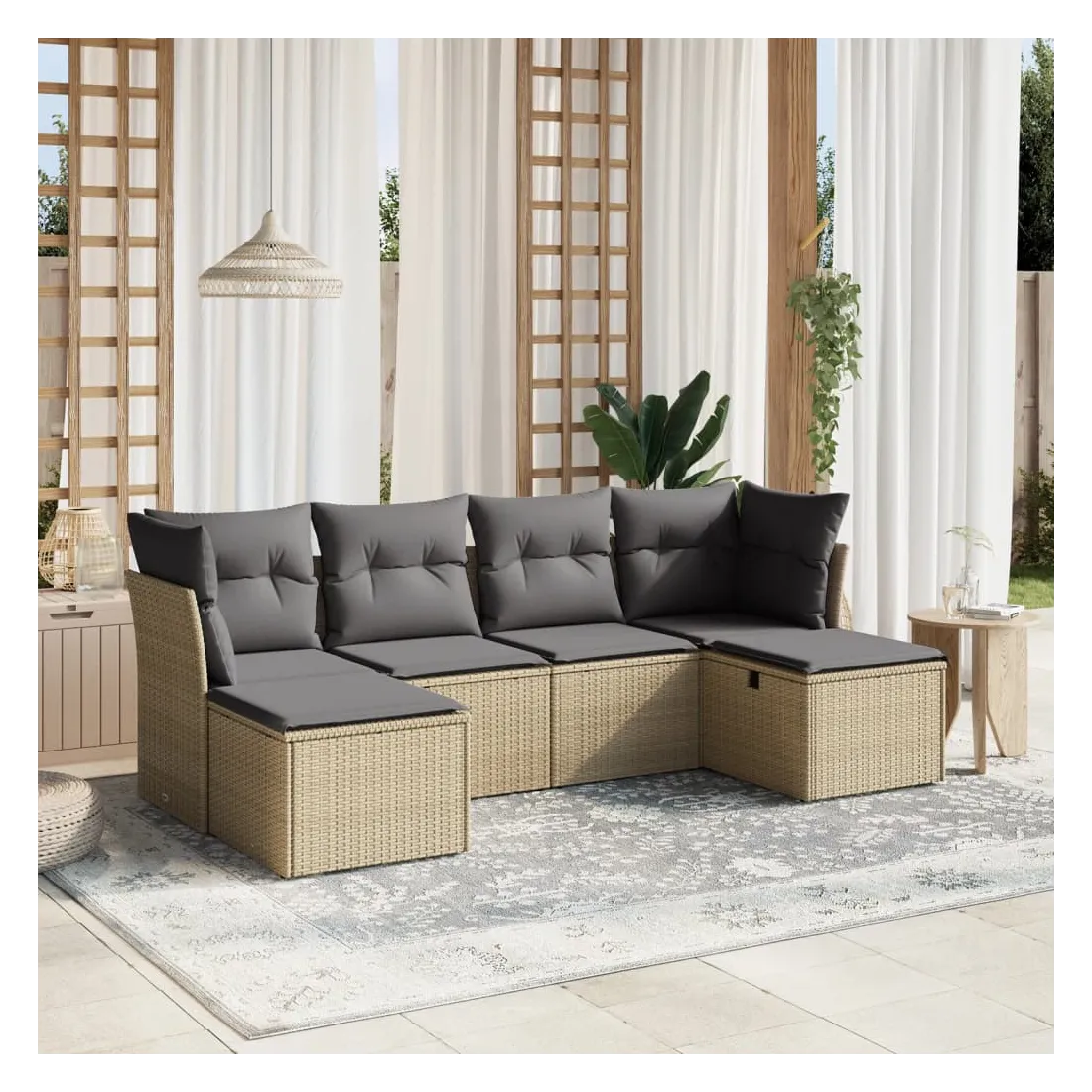 Cet ensemble de canapés de jardin est le complément parfait de votre arrière-cour, terrasse ou patio, offrant un espace confortable et accueillant pour discuter avec la famille et les amis ou simplement se détendre et profiter de l'extérieur. Matériau durable : la résine tressée, également connue sous le nom de poly rotin, est un matériau synthétique solide et nécessitant peu d'entretien qui ressemble au rotin naturel. Il est léger, facile à nettoyer et couramment utilisé pour les meubles d'extérieur en raison de sa durabilité et de ses propriétés de résistance aux intempéries.Expérience d'assise confortable : ce mobilier d'extérieur, doté de coussins épais, offre une expérience d'assise confortable.Housse amovible et lavable : ces coussins de siège sont dotés de housses amovibles pour un lavage et un entretien faciles.Cadre robuste et stable : le cadre en acier enduit de poudre assure la solidité et la stabilité du meuble de jardin pour une utilisation quotidienne à l'extérieur.Conception modulaire : cet ensemble de meubles d'extérieur a une conception modulaire, ce qui le rend complètement flexible et facile à déplacer, afin que vous puissiez créer un agencement de meubles d'extérieur personnalisé. Bon à savoir :Pour que vos meubles d'extérieur restent beaux, nous vous recommandons de les protéger avec une housse imperméable.