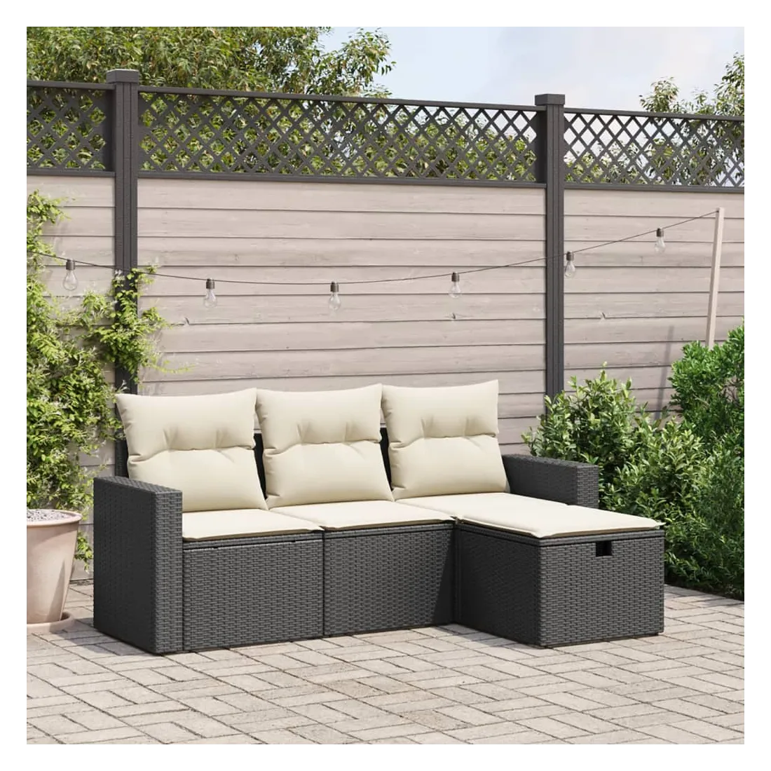 Cet ensemble de canapés de jardin est le complément parfait de votre arrière-cour, terrasse ou patio, offrant un espace confortable et accueillant pour discuter avec la famille et les amis ou simplement se détendre et profiter de l'extérieur. Matériau durable : la résine tressée, également connue sous le nom de poly rotin, est un matériau synthétique solide et nécessitant peu d'entretien qui ressemble au rotin naturel. Il est léger, facile à nettoyer et couramment utilisé pour les meubles d'extérieur en raison de sa durabilité et de ses propriétés de résistance aux intempéries.Expérience d'assise confortable : ce mobilier d'extérieur, doté de coussins épais, offre une expérience d'assise confortable.Housse amovible et lavable : ces coussins de siège sont dotés de housses amovibles pour un lavage et un entretien faciles.Cadre robuste et stable : le cadre en acier enduit de poudre assure la solidité et la stabilité du meuble de jardin pour une utilisation quotidienne à l'extérieur.Conception modulaire : cet ensemble de meubles d'extérieur a une conception modulaire, ce qui le rend complètement flexible et facile à déplacer, afin que vous puissiez créer un agencement de meubles d'extérieur personnalisé. Bon à savoir :Pour que vos meubles d'extérieur restent beaux, nous vous recommandons de les protéger avec une housse imperméable.