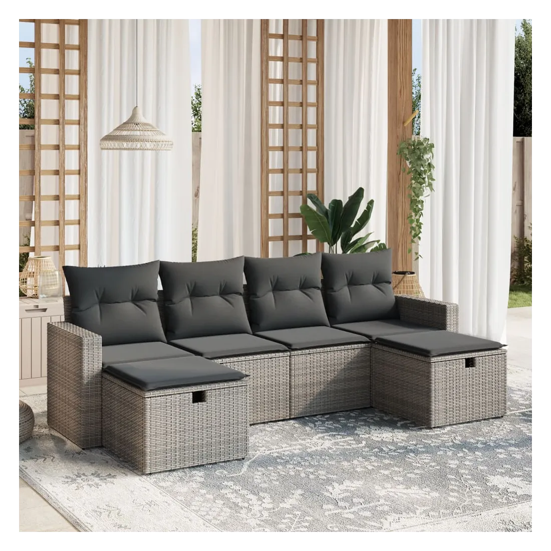 Cet ensemble de canapés de jardin est le complément parfait de votre arrière-cour, terrasse ou patio, offrant un espace confortable et accueillant pour discuter avec la famille et les amis ou simplement se détendre et profiter de l'extérieur. Matériau durable : la résine tressée, également connue sous le nom de poly rotin, est un matériau synthétique solide et nécessitant peu d'entretien qui ressemble au rotin naturel. Il est léger, facile à nettoyer et couramment utilisé pour les meubles d'extérieur en raison de sa durabilité et de ses propriétés de résistance aux intempéries.Expérience d'assise confortable : ce mobilier d'extérieur, doté de coussins épais, offre une expérience d'assise confortable.Housse amovible et lavable : ces coussins de siège sont dotés de housses amovibles pour un lavage et un entretien faciles.Cadre robuste et stable : le cadre en acier enduit de poudre assure la solidité et la stabilité du meuble de jardin pour une utilisation quotidienne à l'extérieur.Conception modulaire : cet ensemble de meubles d'extérieur a une conception modulaire, ce qui le rend complètement flexible et facile à déplacer, afin que vous puissiez créer un agencement de meubles d'extérieur personnalisé. Bon à savoir :Pour que vos meubles d'extérieur restent beaux, nous vous recommandons de les protéger avec une housse imperméable.