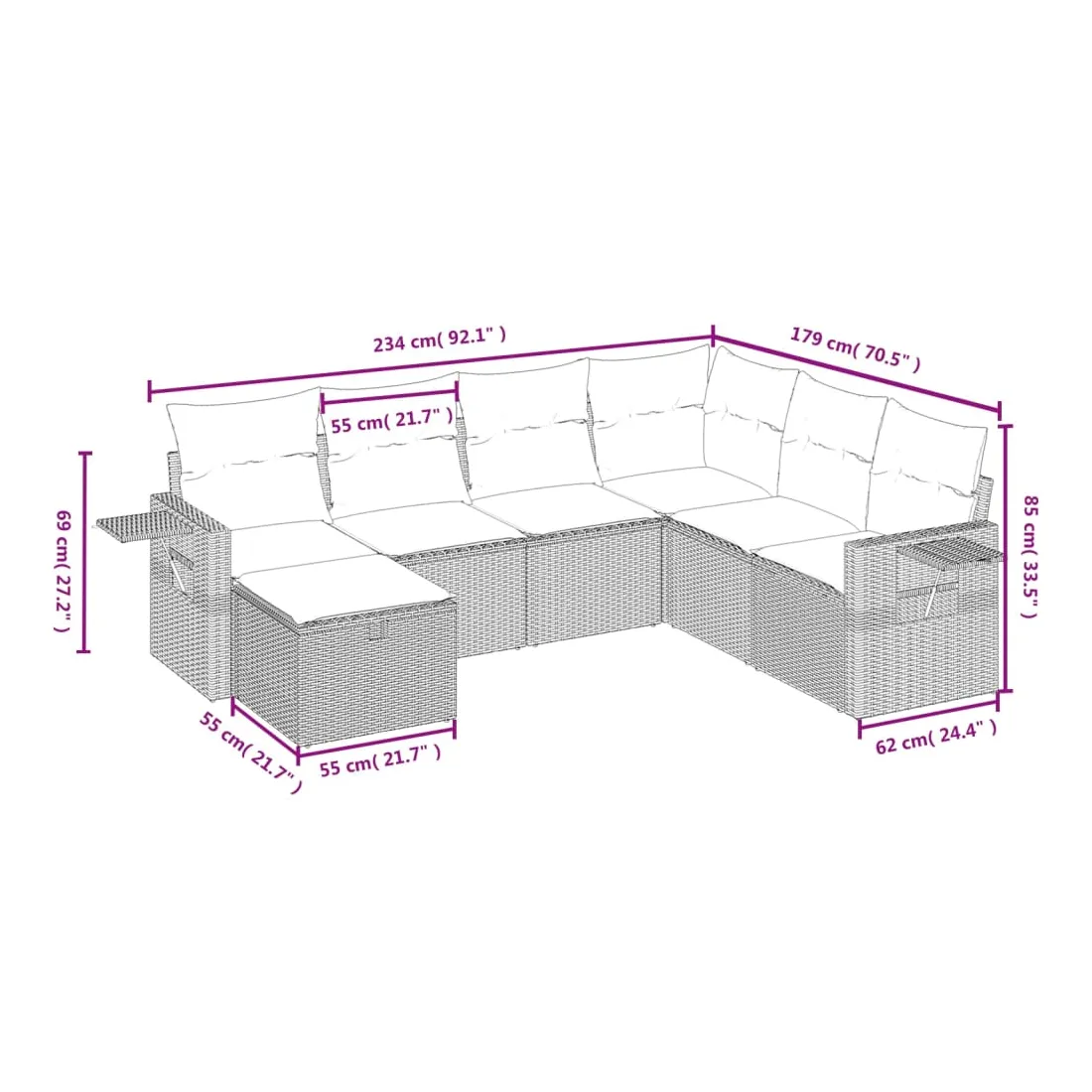 Cet ensemble de canapés de jardin est le complément parfait de votre arrière-cour, terrasse ou patio, offrant un espace confortable et accueillant pour discuter avec la famille et les amis ou simplement se détendre et profiter de l'extérieur. Matériau durable : la résine tressée, également connue sous le nom de poly rotin, est un matériau synthétique solide et nécessitant peu d'entretien qui ressemble au rotin naturel. Il est léger, facile à nettoyer et couramment utilisé pour les meubles d'extérieur en raison de sa durabilité et de ses propriétés de résistance aux intempéries.Expérience d'assise confortable : ce mobilier d'extérieur, doté de coussins épais, offre une expérience d'assise confortable.Housse amovible et lavable : ces coussins de siège sont dotés de housses amovibles pour un lavage et un entretien faciles.Cadre robuste et stable : le cadre en acier enduit de poudre assure la solidité et la stabilité du meuble de jardin pour une utilisation quotidienne à l'extérieur.Conception modulaire : cet ensemble de meubles d'extérieur a une conception modulaire, ce qui le rend complètement flexible et facile à déplacer, afin que vous puissiez créer un agencement de meubles d'extérieur personnalisé. Bon à savoir :Pour que vos meubles d'extérieur restent beaux, nous vous recommandons de les protéger avec une housse imperméable.