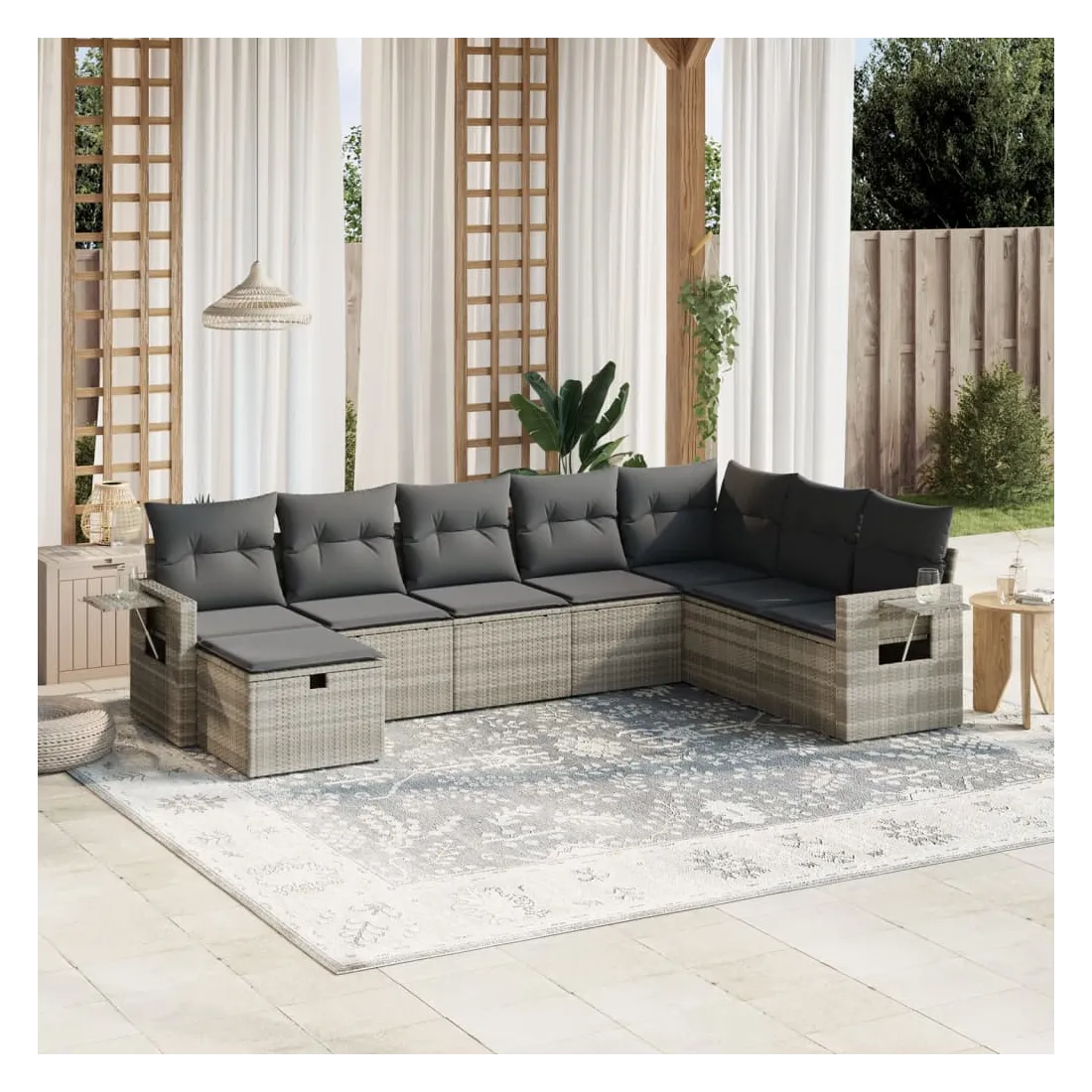 Cet ensemble de canapés de jardin est le complément parfait de votre arrière-cour, terrasse ou patio, offrant un espace confortable et accueillant pour discuter avec la famille et les amis ou simplement se détendre et profiter de l'extérieur. Matériau durable : la résine tressée, également connue sous le nom de poly rotin, est un matériau synthétique solide et nécessitant peu d'entretien qui ressemble au rotin naturel. Il est léger, facile à nettoyer et couramment utilisé pour les meubles d'extérieur en raison de sa durabilité et de ses propriétés de résistance aux intempéries.Expérience d'assise confortable : ce mobilier d'extérieur, doté de coussins épais, offre une expérience d'assise confortable.Housse amovible et lavable : ces coussins de siège sont dotés de housses amovibles pour un lavage et un entretien faciles.Cadre robuste et stable : le cadre en acier enduit de poudre assure la solidité et la stabilité du meuble de jardin pour une utilisation quotidienne à l'extérieur.Conception modulaire : cet ensemble de meubles d'extérieur a une conception modulaire, ce qui le rend complètement flexible et facile à déplacer, afin que vous puissiez créer un agencement de meubles d'extérieur personnalisé. Bon à savoir :Pour que vos meubles d'extérieur restent beaux, nous vous recommandons de les protéger avec une housse imperméable.