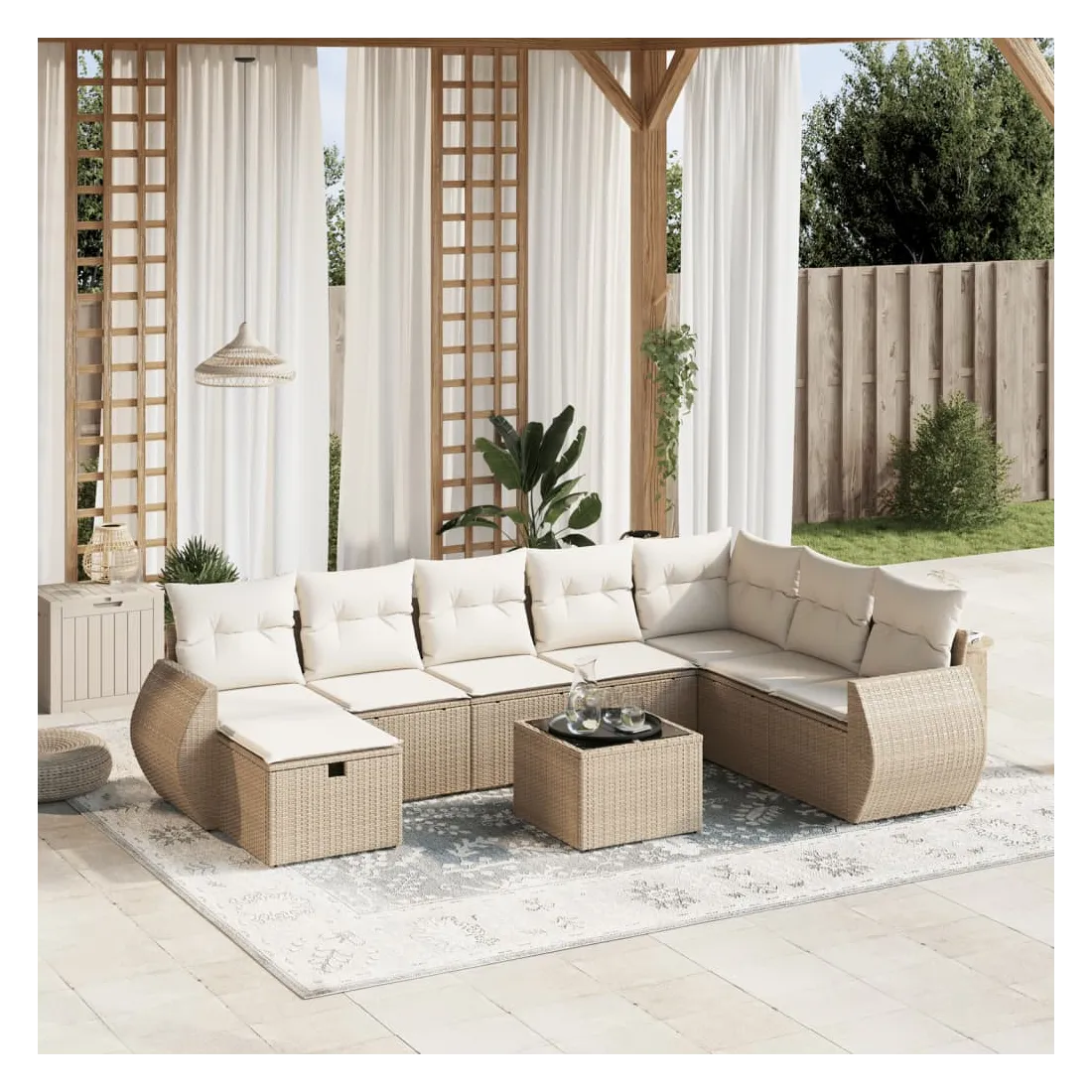Cet ensemble de canapés de jardin est le complément parfait de votre arrière-cour, terrasse ou patio, offrant un espace confortable et accueillant pour discuter avec la famille et les amis ou simplement se détendre et profiter de l'extérieur. Matériau durable : la résine tressée, également connue sous le nom de poly rotin, est un matériau synthétique solide et nécessitant peu d'entretien qui ressemble au rotin naturel. Il est léger, facile à nettoyer et couramment utilisé pour les meubles d'extérieur en raison de sa durabilité et de ses propriétés de résistance aux intempéries.Dessus en verre : le dessus de la table d'extérieur est fabriqué en verre trempé solide et durable, ce qui le rend facile à nettoyer avec un chiffon humide et ajoute une touche d'élégance à votre espace extérieur.Housse amovible et lavable : ces coussins de siège sont dotés de housses amovibles pour un lavage et un entretien faciles.Cadre robuste et stable : le cadre en acier enduit de poudre assure la solidité et la stabilité du meuble de jardin pour une utilisation quotidienne à l'extérieur.Conception modulaire : cet ensemble de meubles d'extérieur a une conception modulaire, ce qui le rend complètement flexible et facile à déplacer, afin que vous puissiez créer un agencement de meubles d'extérieur personnalisé. Bon à savoir :Pour que vos meubles d'extérieur restent beaux, nous vous recommandons de les protéger avec une housse imperméable.