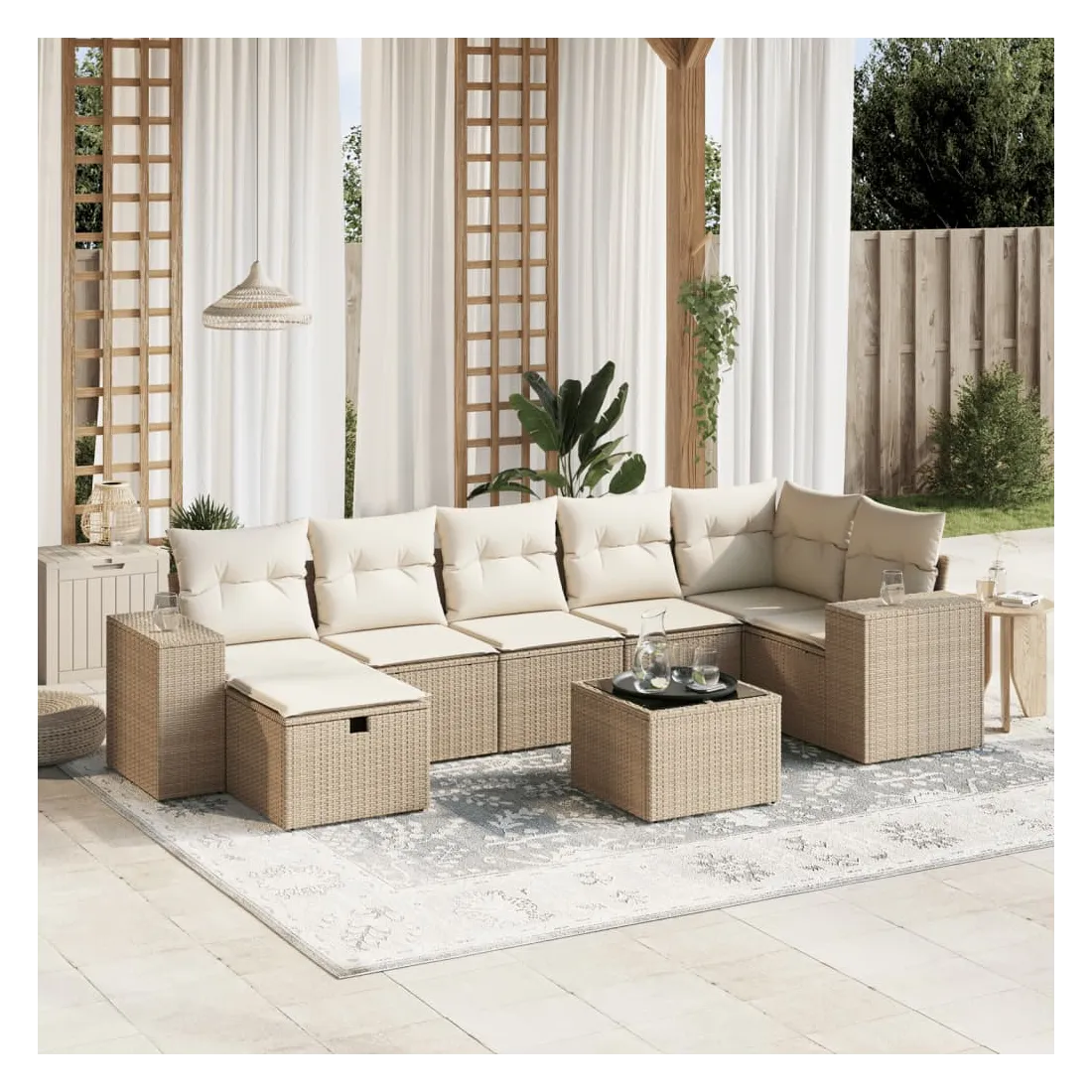 Cet ensemble de canapés de jardin est le complément parfait de votre arrière-cour, terrasse ou patio, offrant un espace confortable et accueillant pour discuter avec la famille et les amis ou simplement se détendre et profiter de l'extérieur. Matériau durable : la résine tressée, également connue sous le nom de poly rotin, est un matériau synthétique solide et nécessitant peu d'entretien qui ressemble au rotin naturel. Il est léger, facile à nettoyer et couramment utilisé pour les meubles d'extérieur en raison de sa durabilité et de ses propriétés de résistance aux intempéries.Dessus en verre : le dessus de la table d'extérieur est fabriqué en verre trempé solide et durable, ce qui le rend facile à nettoyer avec un chiffon humide et ajoute une touche d'élégance à votre espace extérieur.Housse amovible et lavable : ces coussins de siège sont dotés de housses amovibles pour un lavage et un entretien faciles.Cadre robuste et stable : le cadre en acier enduit de poudre assure la solidité et la stabilité du meuble de jardin pour une utilisation quotidienne à l'extérieur.Conception modulaire : cet ensemble de meubles d'extérieur a une conception modulaire, ce qui le rend complètement flexible et facile à déplacer, afin que vous puissiez créer un agencement de meubles d'extérieur personnalisé. Bon à savoir :Pour que vos meubles d'extérieur restent beaux, nous vous recommandons de les protéger avec une housse imperméable.