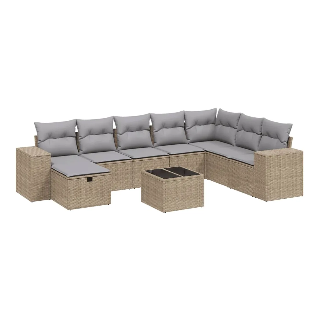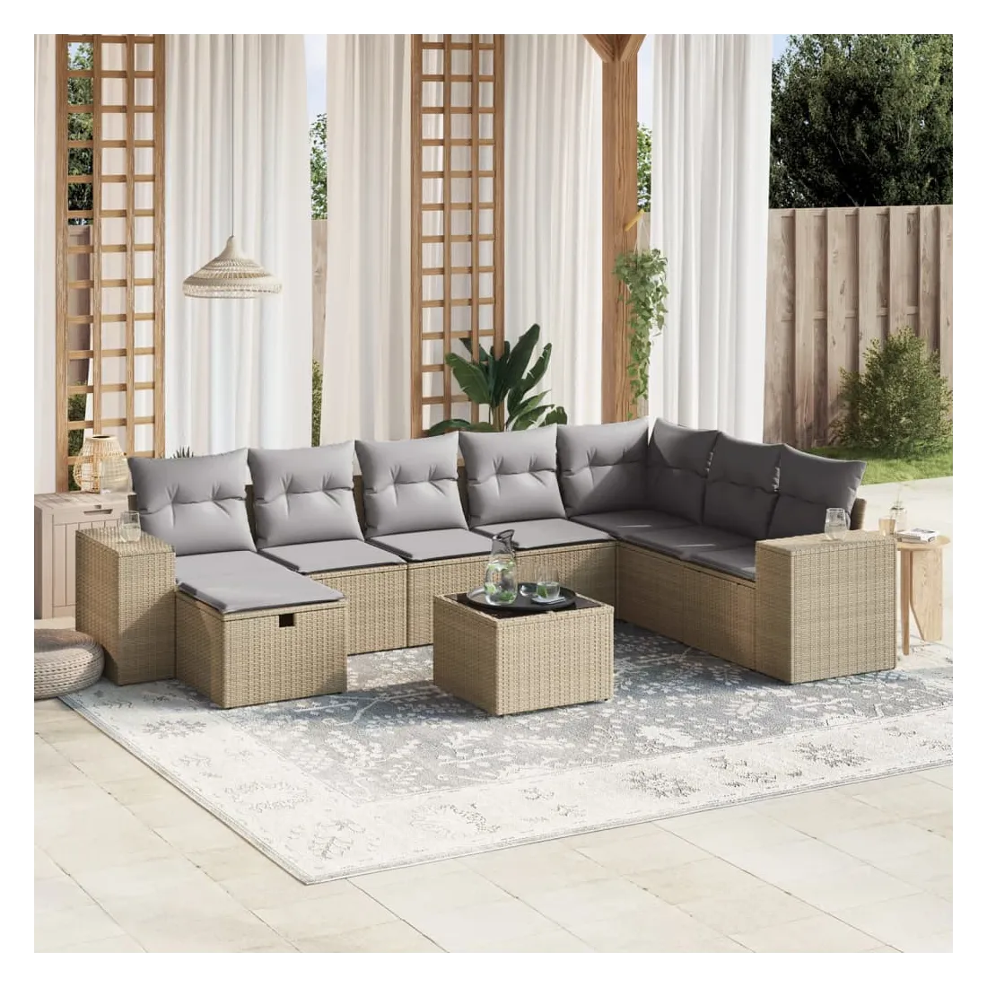 Cet ensemble de canapés de jardin est le complément parfait de votre arrière-cour, terrasse ou patio, offrant un espace confortable et accueillant pour discuter avec la famille et les amis ou simplement se détendre et profiter de l'extérieur. Matériau durable : la résine tressée, également connue sous le nom de poly rotin, est un matériau synthétique solide et nécessitant peu d'entretien qui ressemble au rotin naturel. Il est léger, facile à nettoyer et couramment utilisé pour les meubles d'extérieur en raison de sa durabilité et de ses propriétés de résistance aux intempéries.Dessus en verre : le dessus de la table d'extérieur est fabriqué en verre trempé solide et durable, ce qui le rend facile à nettoyer avec un chiffon humide et ajoute une touche d'élégance à votre espace extérieur.Housse amovible et lavable : ces coussins de siège sont dotés de housses amovibles pour un lavage et un entretien faciles.Cadre robuste et stable : le cadre en acier enduit de poudre assure la solidité et la stabilité du meuble de jardin pour une utilisation quotidienne à l'extérieur.Conception modulaire : cet ensemble de meubles d'extérieur a une conception modulaire, ce qui le rend complètement flexible et facile à déplacer, afin que vous puissiez créer un agencement de meubles d'extérieur personnalisé. Bon à savoir :Pour que vos meubles d'extérieur restent beaux, nous vous recommandons de les protéger avec une housse imperméable.