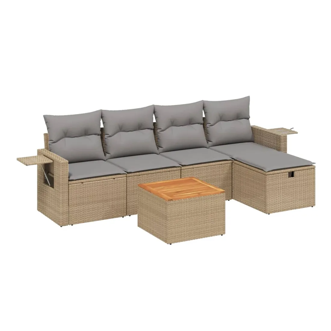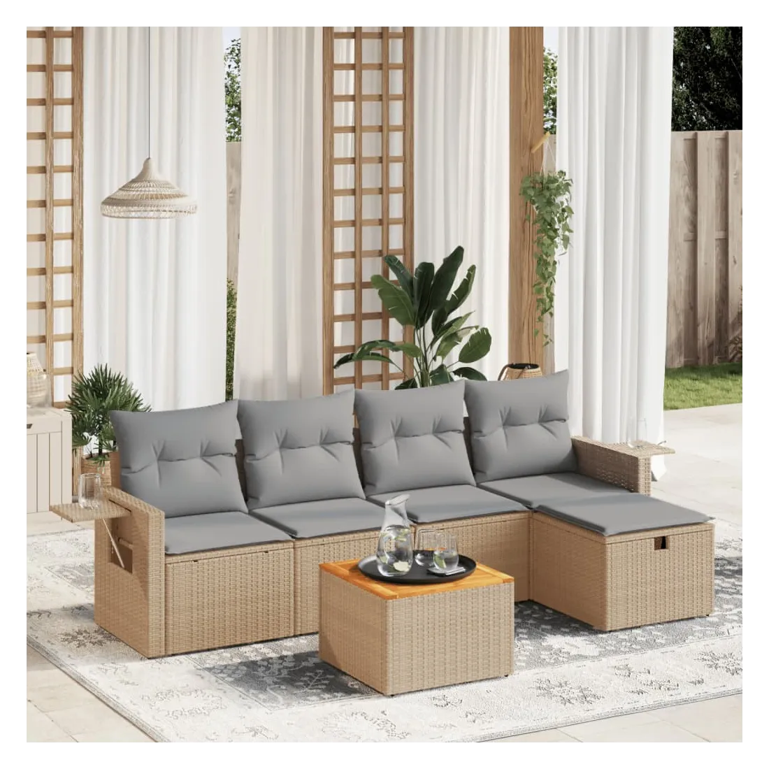 Cet ensemble de canapés de jardin est le complément parfait de votre arrière-cour, terrasse ou patio, offrant un espace confortable et accueillant pour discuter avec la famille et les amis ou simplement se détendre et profiter de l'extérieur. Matériau durable : la résine tressée, également connue sous le nom de poly rotin, est un matériau synthétique solide et nécessitant peu d'entretien qui ressemble au rotin naturel. Il est léger, facile à nettoyer et couramment utilisé pour les meubles d'extérieur en raison de sa durabilité et de ses propriétés de résistance aux intempéries.Dessus stable et facile à nettoyer : cette table de jardin a un dessus en bois d'acacia robuste, durable et facile à nettoyer avec un chiffon humide.Housse amovible et lavable : ces coussins de siège sont dotés de housses amovibles pour un lavage et un entretien faciles.Cadre robuste et stable : le cadre en acier enduit de poudre assure la solidité et la stabilité du meuble de jardin pour une utilisation quotidienne à l'extérieur.Conception modulaire : cet ensemble de meubles d'extérieur a une conception modulaire, ce qui le rend complètement flexible et facile à déplacer, afin que vous puissiez créer un agencement de meubles d'extérieur personnalisé. Bon à savoir :Pour que vos meubles d'extérieur restent beaux, nous vous recommandons de les protéger avec une housse imperméable.