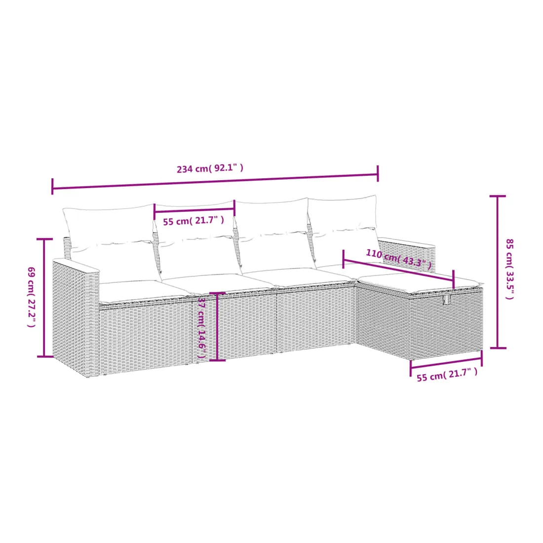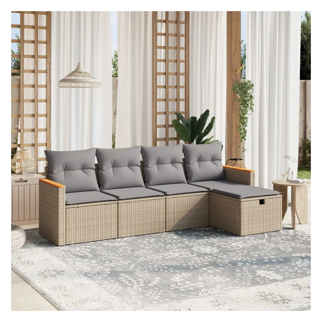 Cet ensemble de canapés de jardin est le complément parfait de votre arrière-cour, terrasse ou patio, offrant un espace confortable et accueillant pour discuter avec la famille et les amis ou simplement se détendre et profiter de l'extérieur. Matériau durable : la résine tressée, également connue sous le nom de poly rotin, est un matériau synthétique solide et nécessitant peu d'entretien qui ressemble au rotin naturel. Il est léger, facile à nettoyer et couramment utilisé pour les meubles d'extérieur en raison de sa durabilité et de ses propriétés de résistance aux intempéries.Expérience d'assise confortable : ce mobilier d'extérieur, doté de coussins épais, offre une expérience d'assise confortable.Housse amovible et lavable : ces coussins de siège sont dotés de housses amovibles pour un lavage et un entretien faciles.Cadre robuste et stable : le cadre en acier enduit de poudre assure la solidité et la stabilité du meuble de jardin pour une utilisation quotidienne à l'extérieur.Conception modulaire : cet ensemble de meubles d'extérieur a une conception modulaire, ce qui le rend complètement flexible et facile à déplacer, afin que vous puissiez créer un agencement de meubles d'extérieur personnalisé. Bon à savoir :Pour que vos meubles d'extérieur restent beaux, nous vous recommandons de les protéger avec une housse imperméable.