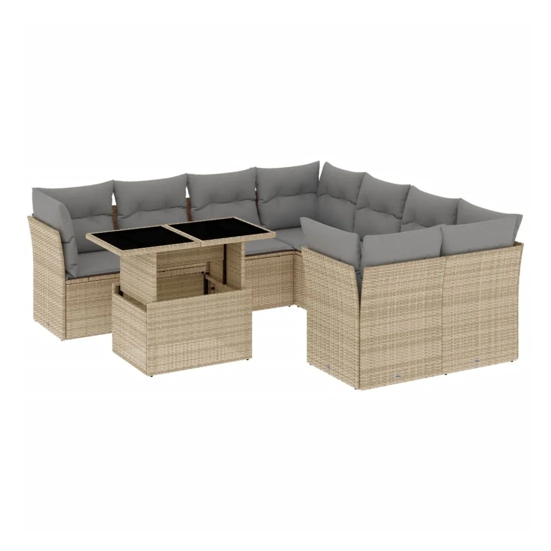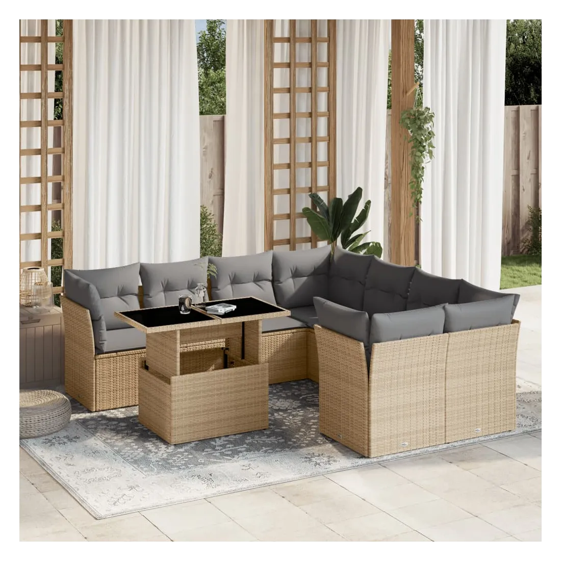 Cet ensemble de canapés de jardin est le complément parfait de votre arrière-cour, terrasse ou patio, offrant un espace confortable et accueillant pour discuter avec la famille et les amis ou simplement se détendre et profiter de l'extérieur. Matériau durable : la résine tressée, également connue sous le nom de poly rotin, est un matériau synthétique solide et nécessitant peu d'entretien qui ressemble au rotin naturel. Il est léger, facile à nettoyer et couramment utilisé pour les meubles d'extérieur en raison de sa durabilité et de ses propriétés de résistance aux intempéries.Dessus de table réglable : le dessus de table peut être soulevé pour rendre la table plus haute, ce qui transforme la table d'extérieur d'une table basse à une table de salle à manger. Elle est parfaite pour recevoir des invités ou prendre des repas à l'extérieur.Expérience d'assise confortable : ce mobilier d'extérieur, doté de coussins épais, offre une expérience d'assise confortable.Housse amovible et lavable : ces coussins de siège sont dotés de housses amovibles pour un lavage et un entretien faciles.Conception modulaire : cet ensemble de meubles d'extérieur a une conception modulaire, ce qui le rend complètement flexible et facile à déplacer, afin que vous puissiez créer un agencement de meubles d'extérieur personnalisé. Bon à savoir :Pour que vos meubles d'extérieur restent beaux, nous vous recommandons de les protéger avec une housse imperméable.