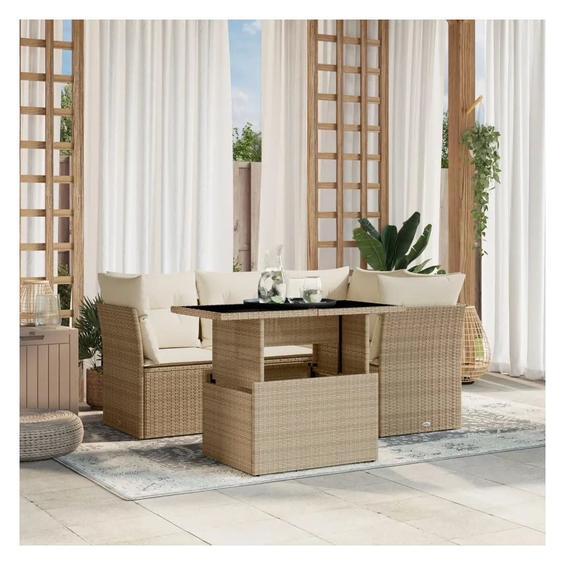 Cet ensemble de canapés de jardin est le complément parfait de votre arrière-cour, terrasse ou patio, offrant un espace confortable et accueillant pour discuter avec la famille et les amis ou simplement se détendre et profiter de l'extérieur. Matériau durable : la résine tressée, également connue sous le nom de poly rotin, est un matériau synthétique solide et nécessitant peu d'entretien qui ressemble au rotin naturel. Il est léger, facile à nettoyer et couramment utilisé pour les meubles d'extérieur en raison de sa durabilité et de ses propriétés de résistance aux intempéries.Dessus de table réglable : le dessus de table peut être soulevé pour rendre la table plus haute, ce qui transforme la table d'extérieur d'une table basse à une table de salle à manger. Elle est parfaite pour recevoir des invités ou prendre des repas à l'extérieur.Expérience d'assise confortable : ce mobilier d'extérieur, doté de coussins épais, offre une expérience d'assise confortable.Housse amovible et lavable : ces coussins de siège sont dotés de housses amovibles pour un lavage et un entretien faciles.Conception modulaire : cet ensemble de meubles d'extérieur a une conception modulaire, ce qui le rend complètement flexible et facile à déplacer, afin que vous puissiez créer un agencement de meubles d'extérieur personnalisé. Bon à savoir :Pour que vos meubles d'extérieur restent beaux, nous vous recommandons de les protéger avec une housse imperméable.