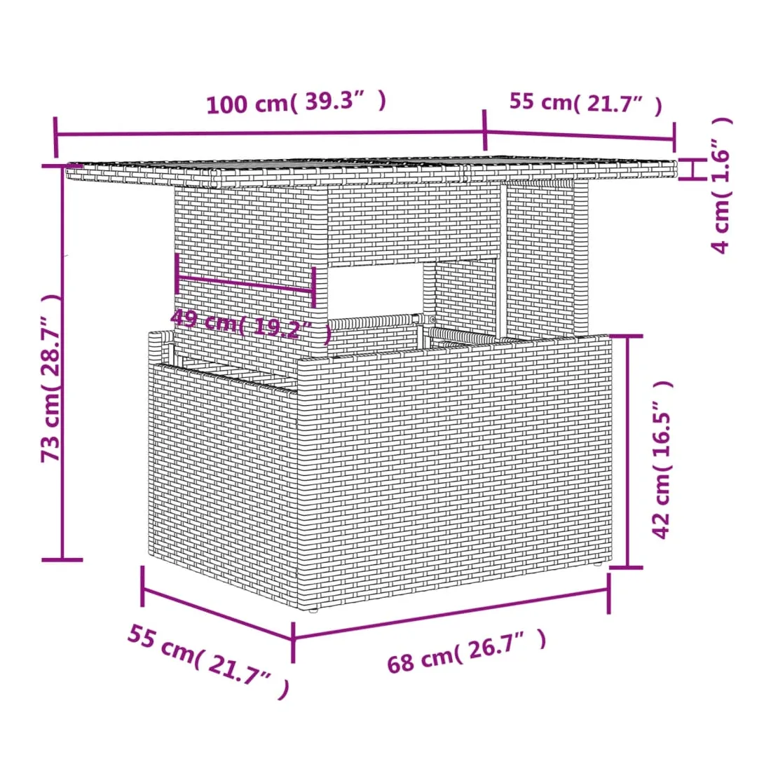 • Matériau : résine tressée, acier enduit de poudre, verre trempé