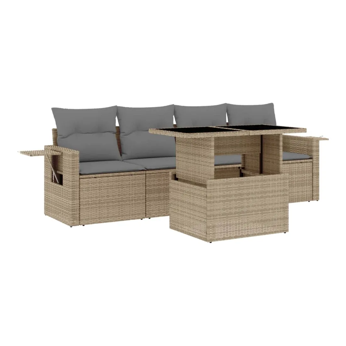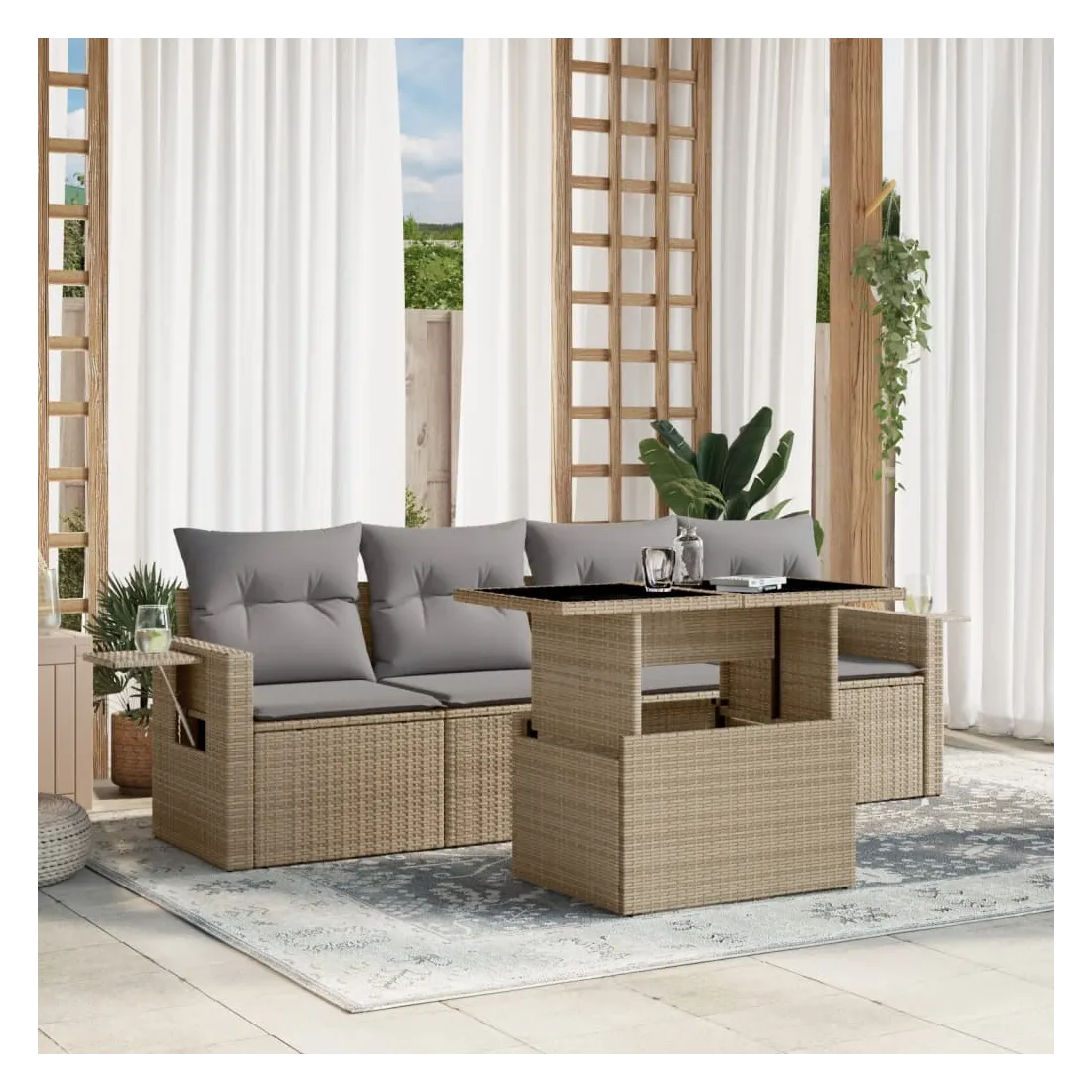 Cet ensemble de canapés de jardin est le complément parfait de votre arrière-cour, terrasse ou patio, offrant un espace confortable et accueillant pour discuter avec la famille et les amis ou simplement se détendre et profiter de l'extérieur. Matériau durable : la résine tressée, également connue sous le nom de poly rotin, est un matériau synthétique solide et nécessitant peu d'entretien qui ressemble au rotin naturel. Il est léger, facile à nettoyer et couramment utilisé pour les meubles d'extérieur en raison de sa durabilité et de ses propriétés de résistance aux intempéries.Dessus de table réglable : le dessus de table peut être soulevé pour rendre la table plus haute, ce qui transforme la table d'extérieur d'une table basse à une table de salle à manger. Elle est parfaite pour recevoir des invités ou prendre des repas à l'extérieur.Table d'appoint pratique : ce mobilier d'extérieur comprend des tables d'appoint pliables avec un ressort à gaz sur les accoudoirs, offrant des endroits pratiques pour garder vos essentiels à portée de main. Expérience d'assise confortable : ce mobilier d'extérieur, doté de coussins épais, offre une expérience d'assise confortable.Conception modulaire : cet ensemble de meubles d'extérieur a une conception modulaire, ce qui le rend complètement flexible et facile à déplacer, afin que vous puissiez créer un agencement de meubles d'extérieur personnalisé. Bon à savoir :Pour que vos meubles d'extérieur restent beaux, nous vous recommandons de les protéger avec une housse imperméable.