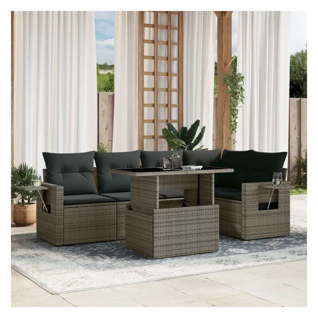 Cet ensemble de canapés de jardin est le complément parfait de votre arrière-cour, terrasse ou patio, offrant un espace confortable et accueillant pour discuter avec la famille et les amis ou simplement se détendre et profiter de l'extérieur. Matériau durable : la résine tressée, également connue sous le nom de poly rotin, est un matériau synthétique solide et nécessitant peu d'entretien qui ressemble au rotin naturel. Il est léger, facile à nettoyer et couramment utilisé pour les meubles d'extérieur en raison de sa durabilité et de ses propriétés de résistance aux intempéries.Dessus de table réglable : le dessus de table peut être soulevé pour rendre la table plus haute, ce qui transforme la table d'extérieur d'une table basse à une table de salle à manger. Elle est parfaite pour recevoir des invités ou prendre des repas à l'extérieur.Table d'appoint pratique : ce mobilier d'extérieur comprend des tables d'appoint pliables avec un ressort à gaz sur les accoudoirs, offrant des endroits pratiques pour garder vos essentiels à portée de main. Expérience d'assise confortable : ce mobilier d'extérieur, doté de coussins épais, offre une expérience d'assise confortable.Conception modulaire : cet ensemble de meubles d'extérieur a une conception modulaire, ce qui le rend complètement flexible et facile à déplacer, afin que vous puissiez créer un agencement de meubles d'extérieur personnalisé. Bon à savoir :Pour que vos meubles d'extérieur restent beaux, nous vous recommandons de les protéger avec une housse imperméable.