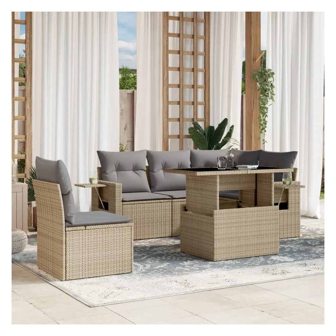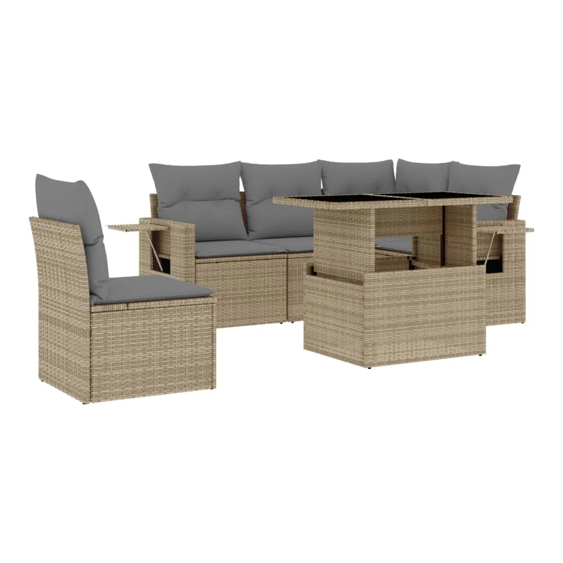 Cet ensemble de canapés de jardin est le complément parfait de votre arrière-cour, terrasse ou patio, offrant un espace confortable et accueillant pour discuter avec la famille et les amis ou simplement se détendre et profiter de l'extérieur. Matériau durable : la résine tressée, également connue sous le nom de poly rotin, est un matériau synthétique solide et nécessitant peu d'entretien qui ressemble au rotin naturel. Il est léger, facile à nettoyer et couramment utilisé pour les meubles d'extérieur en raison de sa durabilité et de ses propriétés de résistance aux intempéries.Dessus de table réglable : le dessus de table peut être soulevé pour rendre la table plus haute, ce qui transforme la table d'extérieur d'une table basse à une table de salle à manger. Elle est parfaite pour recevoir des invités ou prendre des repas à l'extérieur.Table d'appoint pratique : ce mobilier d'extérieur comprend des tables d'appoint pliables avec un ressort à gaz sur les accoudoirs, offrant des endroits pratiques pour garder vos essentiels à portée de main. Expérience d'assise confortable : ce mobilier d'extérieur, doté de coussins épais, offre une expérience d'assise confortable.Conception modulaire : cet ensemble de meubles d'extérieur a une conception modulaire, ce qui le rend complètement flexible et facile à déplacer, afin que vous puissiez créer un agencement de meubles d'extérieur personnalisé. Bon à savoir :Pour que vos meubles d'extérieur restent beaux, nous vous recommandons de les protéger avec une housse imperméable.