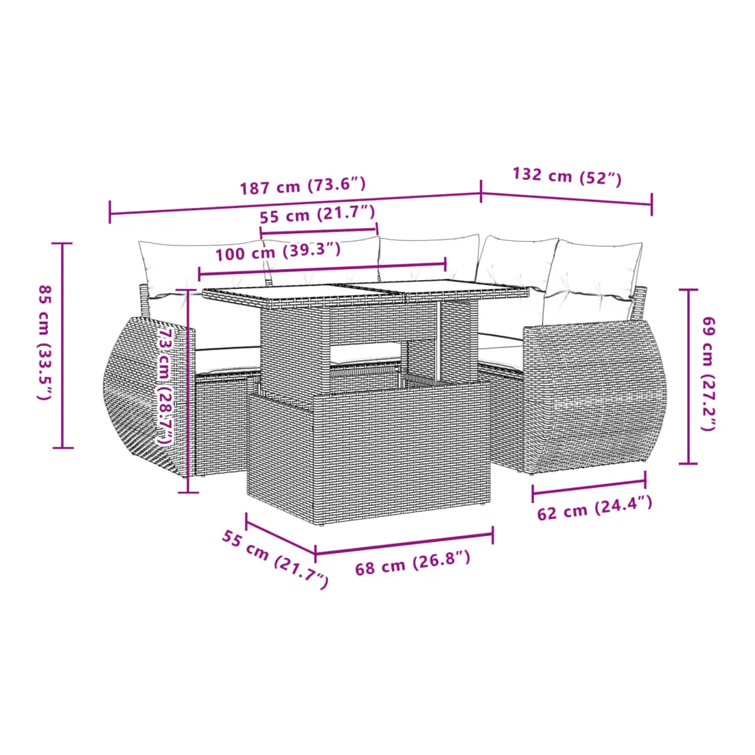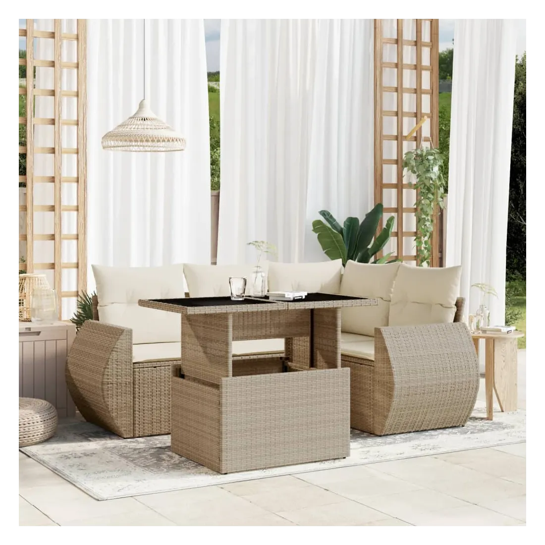 Cet ensemble de canapés de jardin est le complément parfait de votre arrière-cour, terrasse ou patio, offrant un espace confortable et accueillant pour discuter avec la famille et les amis ou simplement se détendre et profiter de l'extérieur. Matériau durable : la résine tressée, également connue sous le nom de poly rotin, est un matériau synthétique solide et nécessitant peu d'entretien qui ressemble au rotin naturel. Il est léger, facile à nettoyer et couramment utilisé pour les meubles d'extérieur en raison de sa durabilité et de ses propriétés de résistance aux intempéries.Dessus de table réglable : le dessus de table peut être soulevé pour rendre la table plus haute, ce qui transforme la table d'extérieur d'une table basse à une table de salle à manger. Elle est parfaite pour recevoir des invités ou prendre des repas à l'extérieur.Expérience d'assise confortable : ce mobilier d'extérieur, doté de coussins épais, offre une expérience d'assise confortable.Housse amovible et lavable : ces coussins de siège sont dotés de housses amovibles pour un lavage et un entretien faciles.Conception modulaire : cet ensemble de meubles d'extérieur a une conception modulaire, ce qui le rend complètement flexible et facile à déplacer, afin que vous puissiez créer un agencement de meubles d'extérieur personnalisé. Bon à savoir :Pour que vos meubles d'extérieur restent beaux, nous vous recommandons de les protéger avec une housse imperméable.